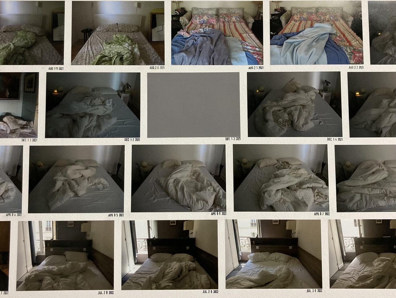 Upon viewing Ellen Bleiwas’ bed series Got Up (2021-2022), I immediately thought of Ling Ma’s novel Severance: “To live in a city is to take part in and to propagate its impossible systems. To wake up. To go to work in the morning. It is also to take pleasure in those systems because, otherwise, who could repeat the same routines, year in, year out?”. I contemplated the way in which routine factors into our existence and the constancy of submitting ourselves to the day. While there may be changes to the details, every day of our lives commences with our wake. Bleiwas successfully captures the sentiment of repetition and waking to repeat in Got Up. Each photograph holds a bed as the subject, adorned with pillows, duvets, and sheets. The linens are strewn about as if someone had just stirred and risen from rest. The consecutive days are documented with the date printed on the wall external to the photograph. Upon closer examination, there are days in which the bed changes, or there is an absence of documentation and instead a grey block is provided in lieu. The grey blocks and differences in bedroom subject matter give variety to the days of rest, a different site to which we return. Converse from sites of rest are sites of labour, though the two may blur. DiCarlo manages to combine the visuals of both in The Propagation of Uncertainty (2020).