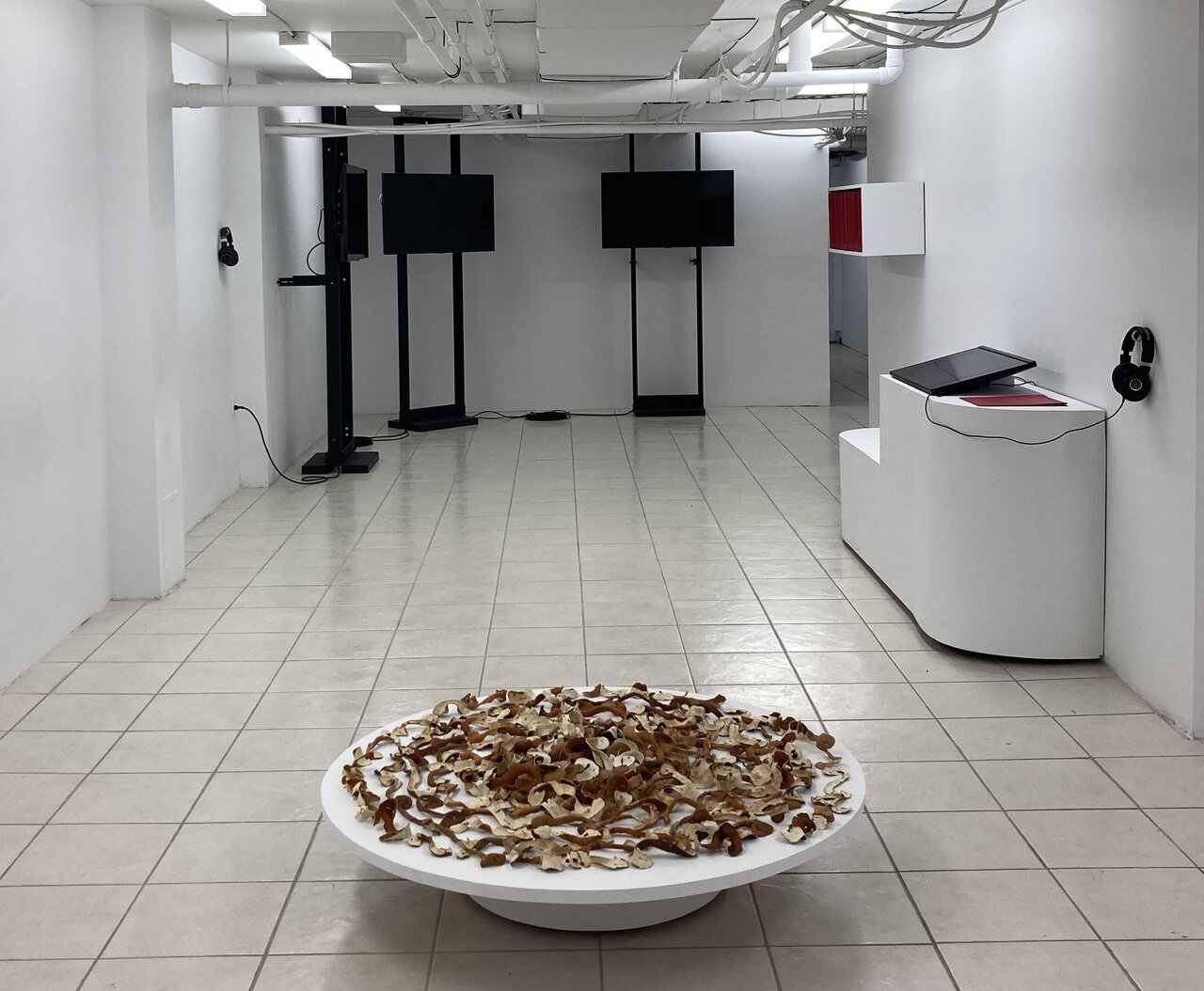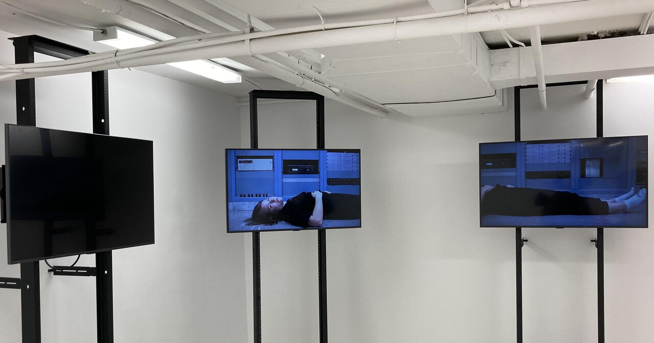 Travelling down the hallway towards a speaker (unfortunately missing the window for the announcements for DiCarlo’s Talking Clock Choir [2022]) I met three televisions and a pair of headphones from DiCarlo’s The Propagation of Uncertainty. The video begins with an introduction to the space of an archive, the National Research Council of Canada, with a pulsating hum and the face of a clock. There is a note stating ‘CALIBRATION IN PROCESS’ visible among the glimpses at different forms of equipment: binders, office phones, cabinets with a medley of wires, and stereo systems. In the auditory background is a voice stating “NRC / Eastern Standard Time” followed by the changing hours, minutes, and seconds repeating as time moves forward. The sound is ongoing featuring an automated recording of a woman’s voice in French, marking the official languages. There is a stream of automated recordings in waves, fostering the experience of being overwhelmed. As the video continues there is a woman lying supine, her breathing visible as she rests still. Her figure gradually shifts from the leftmost screen, then settling, then moves across the remaining two screens, pausing mid-thigh until the video restarts. The inundation of sounds and visuals associated with information collection and retention emphasizes the overstimulation that comes with undertaking work. There is so much to know, and so much we do not know to know.