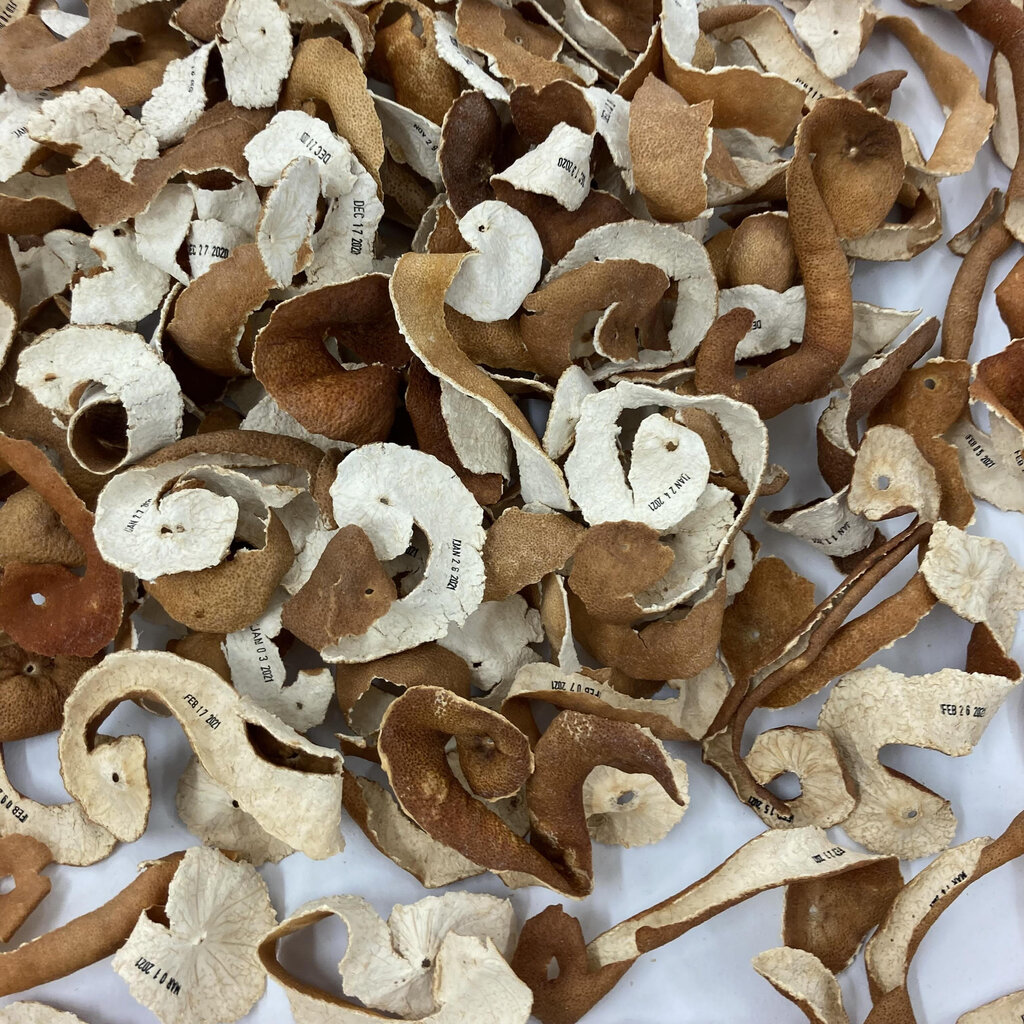 Making time to recalibrate and catch your breath is critical and imperative for one’s health. Taking pause is at the foundation of Bleiwas’ Peel (2020-2021), a spiraling mound of rust, clay, and burnt orange. The work consists of multiple clementine peels, undone in a singular piece often in the shape of an ’s’. The gesture of peeling a clementine in one motion can be imagined, a purposeful slow act prior to enjoying a nutrient-rich treat. Fruit takes time to grow, so why not take time to enjoy? Within the inner layer of the rinds are printed dates, reflecting daily consumption and reminding viewers to do the same to nourish their body.