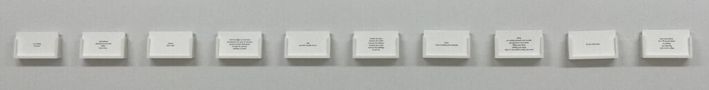 On that same note of taking care of the self is Bleiwas’ Rip (2020-2022), moving towards hygiene as opposed to nutritional nourishment. Rip is a fleet of unused toilet paper sheets, serving as a material sample from each day with the date noted accordingly. Though they appear uniform, the distinct perforations and thickness can be recognized upon closer view. The differences in toilet paper reflects the fact that the way we address our needs shifts based on what is available and what one can afford. At a time when toilet paper was a scarce commodity, how can one be loyal to a brand— and why would they? Capitalism rewards loyalty through marketed pride, points, and bonus items, but when that loyalty does not exist the market variety is salient. Rip showcases such a variety, identifiable by the ridges, waves, and concentric circles. The correlation between how we care for ourselves based on what can be afforded or obtained is readily apparent, in this work and throughout the hole fits the worm, but only as it moves.