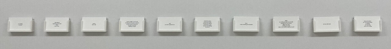 Towards the back of the gallery is Bleiwas’, DiCarlo’s, and Kohleal’s Prompt (2023-ongoing), a rolodex holding (presumably) tasks to complete yet they cannot be accessed. This is a mirror to the reality of knowing that there is always more to do, though exactly what is to be done is not always clear, despite expectations. The deluge of information and labour can leave one inert as time passes, in a loop of attempting to recharge to ready again.