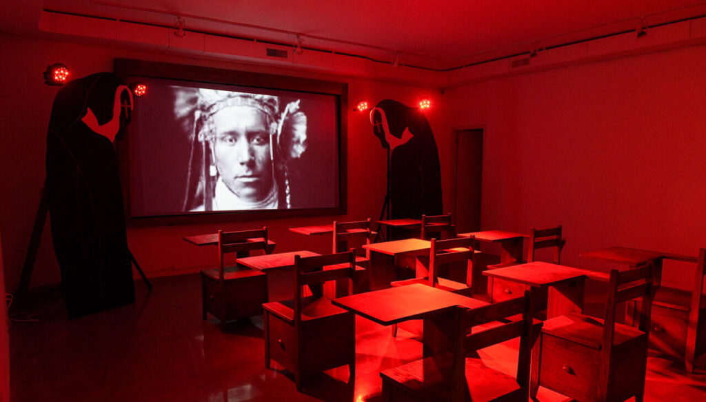 Fading Memories of Home, 2021, Multi-Media Installation including carved desks, plywood cut-out figures, video and soundtrack Edition 2