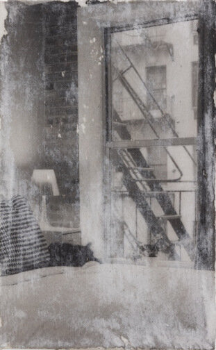 Garrett Lockhart, Fire Escape, 2023, inkjet transfer on cotton over board, 5 x 7 inches