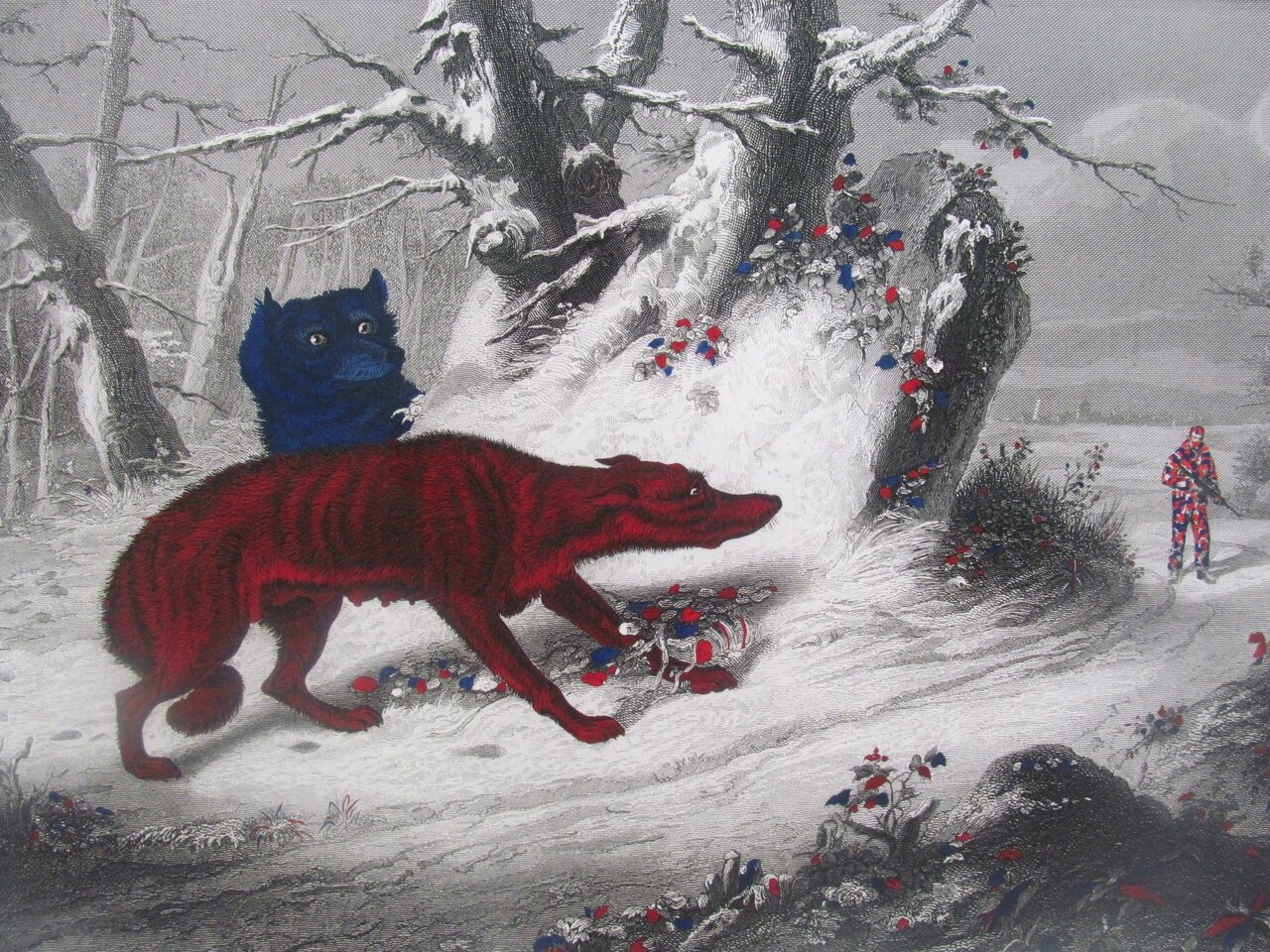 The title refers to the colours of the American flag. These colours, when applied to the prints, draw political parallels between the past and the present USA; while also making the prints more vibrant. The original prints depicted a culture where white males were dominant in the culture and their activities were celebrated. An example of this is the “Wolves” where two wolves – one red and one blue – are seen with a male hunter holding a rifle in hand, dressed in a camouflage outfit of red, white and blue.