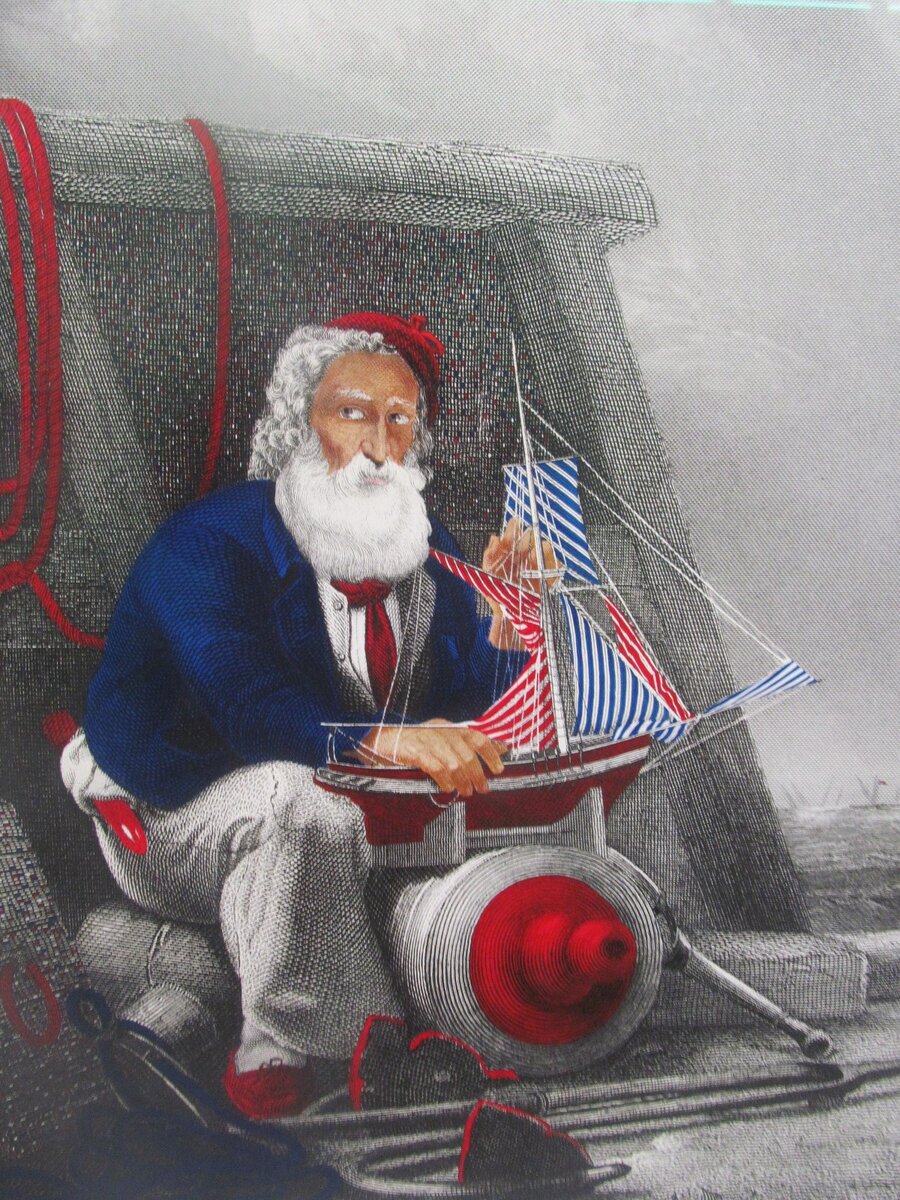The 15 painted, archival prints transfer the engravings into the present. Two of my favourite works were the “Wolves” and “Jack” mounted on the south wall of the gallery. The etching, Jack, has a bearded older male with a model ship. The original black and white print seems very dire but after it is painted it becomes somewhat comical.