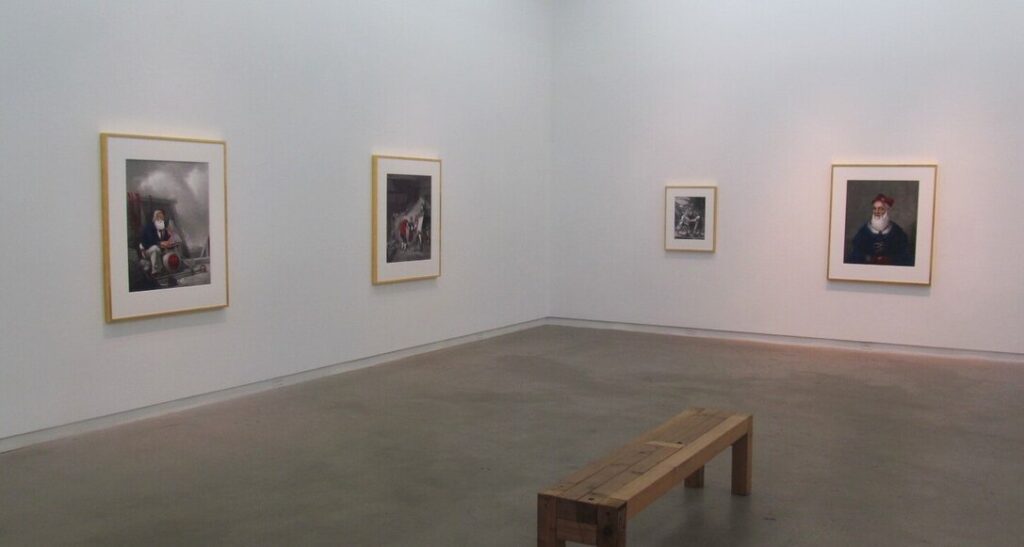 Originally beautifully framed, in milled maple with water gilded 22kt gold and printed on Japanese paper, these etchings were done reflecting a different time. The depictions in the engravings are of mostly white men and they represent the 19th century. Massey, after the 2016 US election, saw these prints relevant of what was happening politically in the USA now: the embracing of past values and a loss of liberalism. Gregory Burke has written a wonderful essay which better captures the essence of this exhibition and the context of Massey’s work in the attractive hard bound book that accompanies the show.