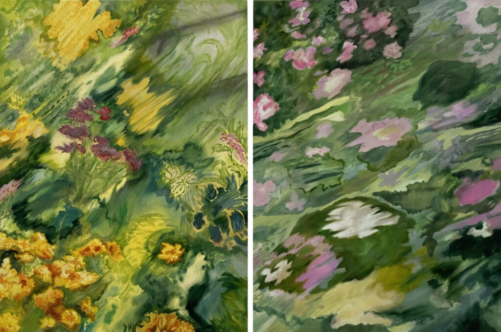 Béatrice Côté, Fleurs Soleil, 2023, oil on canvas, 48 x 36 inches (left) and Fleurs Babar, 2023, oil on canvas, 46 x 36 in (right)