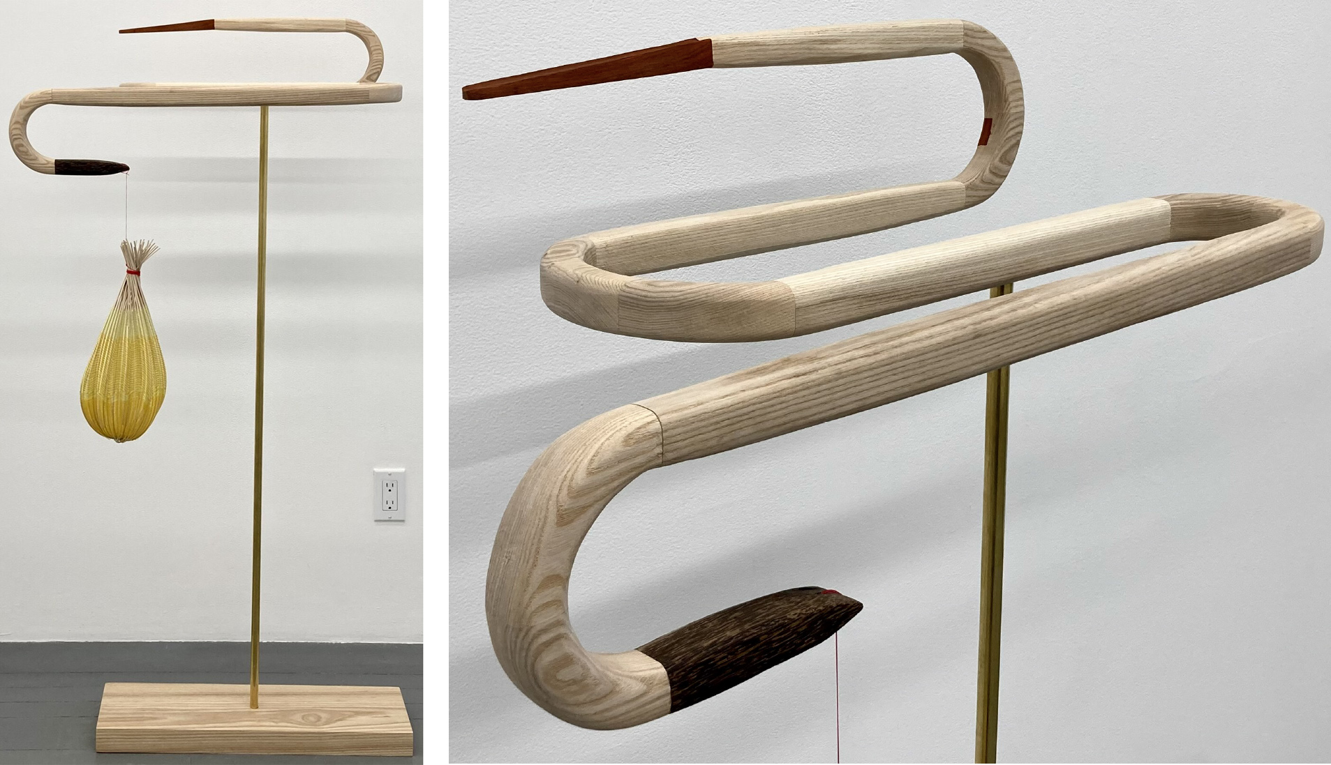 Kristi Chen, The Snake and the Pomelo, 2024, Ash wood, Paduk wood, Palmwood, crystal beading thread, round rattan, metal rod, 65 x 40 x 14 inches (left) and detail (right)