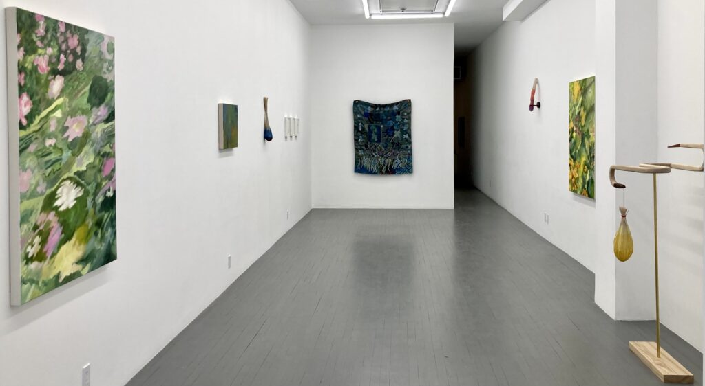 Produce is a common subject matter throughout the works in Also a Good Place to Sulk, inherently linked to gardens through growth and harvest. Kristi Chen’s contributions are a reimagining of various fruits, recreated with rattan reeds, palmwood, and paduk wood, adorned with crystal beading. The “Invasive Blueberry” is realized as a teardrop, a gradient of blues enveloping the underbelly of the fruit. Meanwhile, “Dragonfruit” is a pleasure to explore from different angles. Facing it directly, “Dragonfruit” appears as a creature swooping downwards. Viewed directly from below one can see a face, with a snout formed by the crossing of rattan reeds. The wooden clasp holding the piece in place suggests ears framing the head of the beast.