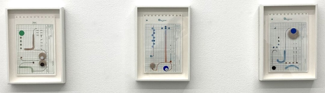 The winding figure accompanied by circular motifs is also evident in Bronson Smillie’s felt drawings. The series features felt stickers, circles and soft lines in a muted palette, composed on ledger sheets. The colours prompt imagery of ponds, reeds, root systems, and flowering branches. Utilizing the bureaucratic sheets in this way is a playful subversion, as if the artist wants us to consider a balance with nature even in administrative settings.