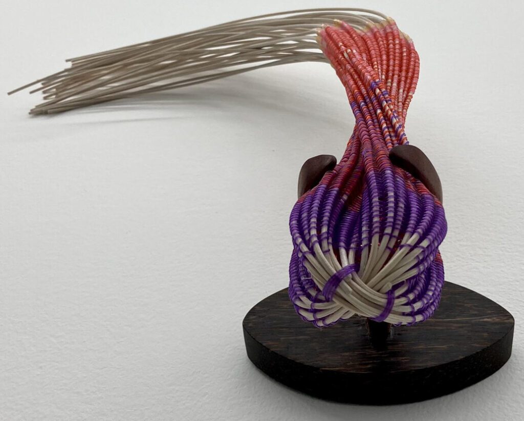 (Viewed from below) Kristie Chen, Dragonfruit, 2024, crystal beading, thread, round rattan reed, palmwood, paduk wood, 23 x 6 x 3 inches