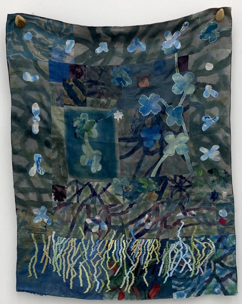 The idea of being enveloped and immersed in a floral visual is observable in Laurel Rennie’s “Night Roots”. The textile piece is an assemblage of naturally dyed fibers and fabric patches formed into a quilt. “Night Roots” appears as an alternative tree. On the surface of the work, towards the bottom, are a variety of roots full of vitality. At the top is a frame of flowers, dyed and sewn onto the fabric of the piece. “Night Roots” captures the confusing immersion into the subconscious world, one where the primordial desire to be attuned to nature is well known. Rennie’s work is an example of dreams being realized in the material world.