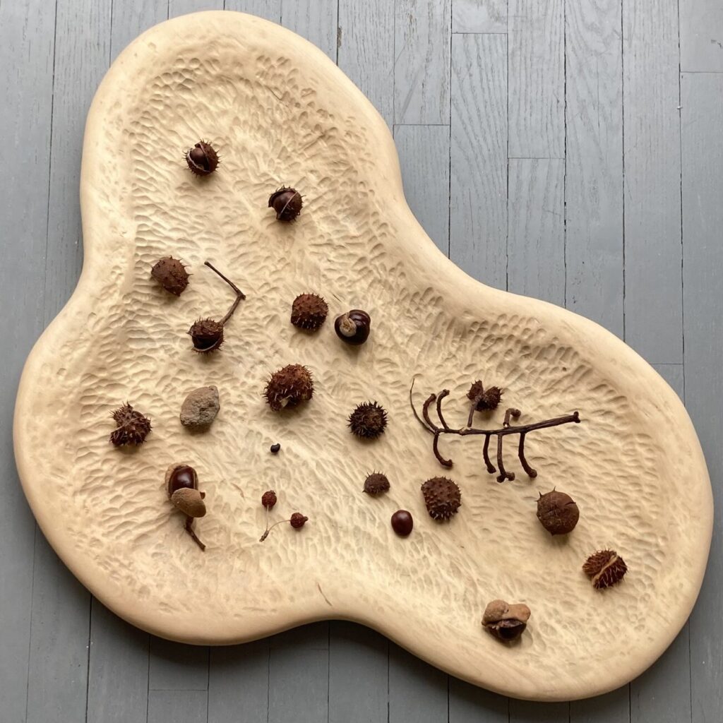 Immediately upon entry there appears to be a shallow bowl filled with remnants that remind me of lychee, rambutan, and longan. I imagined the mild taste of the longan’s flesh and the sensation of tearing it from the pit. Upon closer inspection I realize they are chestnuts. Laurel Rennie’s “Muster” is a tableau, the stage carved out of basswood, with soft indents like the texture of the shells. The depth of the outward flecks holds viewers focus at the center of the organic shape. Movement and organic shapes are present throughout the exhibition, straying away from harsh forms and opting for natural materials.