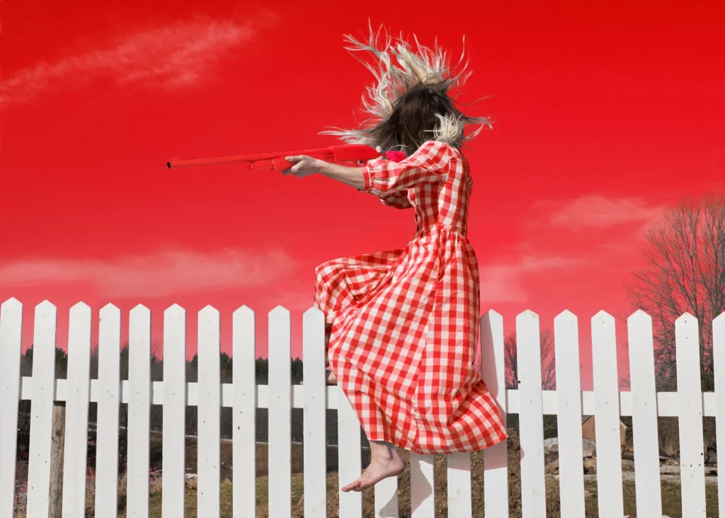 Sage began to experiment with photography when she was 22, living in Montreal. But since then, like her grandparents, she made her own life-changing decision to move away from the city to a remote rural homestead, where she was able to experience what it is like to live in the countryside. While learning and unlearning habits of the past, Sage’s art takes this opportunity to document her present life resulting in a great leap in her work. A good example is “Centrist IV”, staged in a rural area, where she is sitting on a fence using things such as a blower for her hair, a farm dress and no shoes at all. Lately, she is creating images very different than she used to.