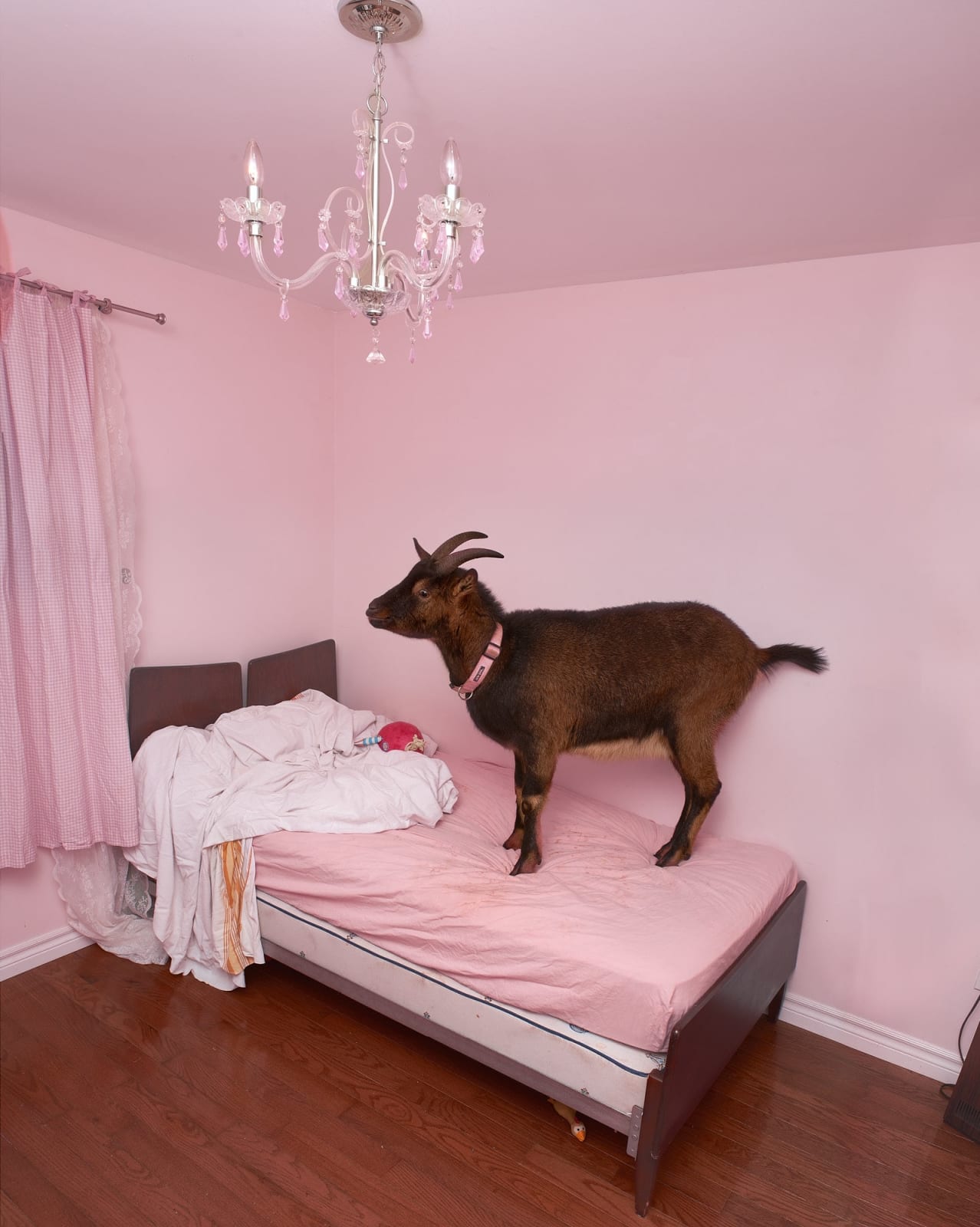 In “Girls Room,”Sage tells a story of her childhood. When they moved into their new home, she was greeted by abandoned dairy goats roaming the house. One of them was wearing a pink collar, indicating that it was kept as a pet by the daughter of the previous owners. This photography portrays a piercing narrative of nostalgia. This sense of an abandoned place made the artist think about how hard it must be to get used to an empty house where there was once a home filled with life and laughter. And now that there are people living in the house again, how challenging it is for them to make themselves comfortable, even with all of those goats around and some of them not very friendly at first.