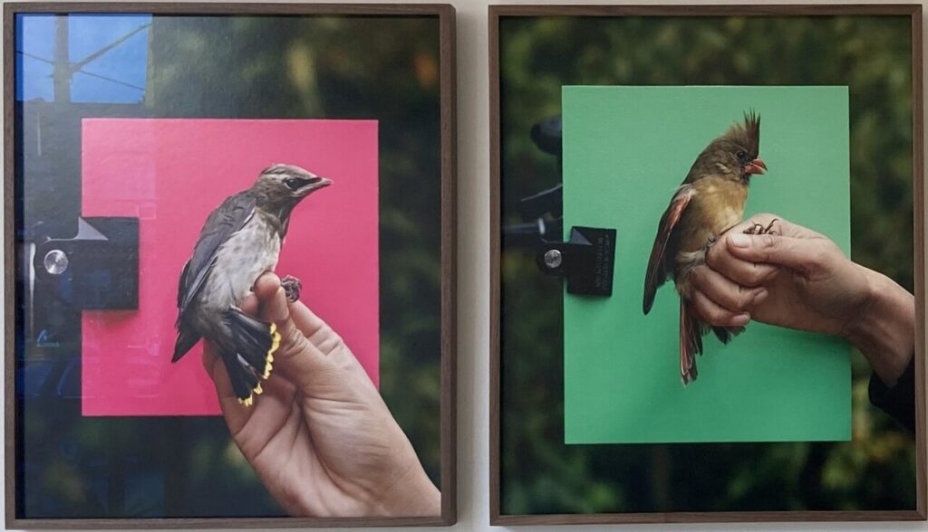 The series is comprised of 8 photographs, each with a bird as the primary subject held in place by a human hand, the latter varying in position: a pinch, a fist, a grasp accompanied by a stern point. The photographs have been installed in pairs, with a larger gap in space between each set. There is an array of background colour blocks, one for each portrait: neon pink, sea-foam green, tangerine, cobalt, crimson, pear green, canary yellow, and cerulean. The selection of colours is lively and works with the features of the subject. For example, the cadmium yellow tail feathers of the Cedar Waxwing in CEWA + LULI is paired with neon pink in a coordinated effort to attract interest. Meanwhile, the green of NOCA + ELGR forms a subtle contrast to the agape rust beak of the Northern Cardinal. The wooden frames complement the foliage that is consistent in the background of the series, nature being further emphasized by the plants within the space.