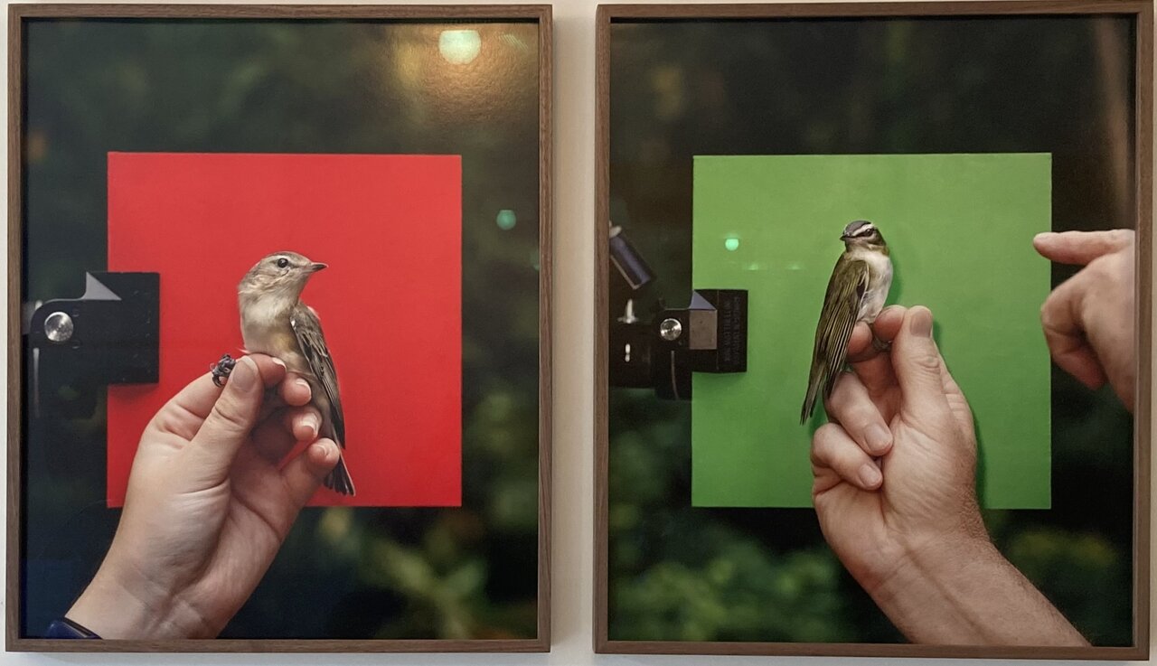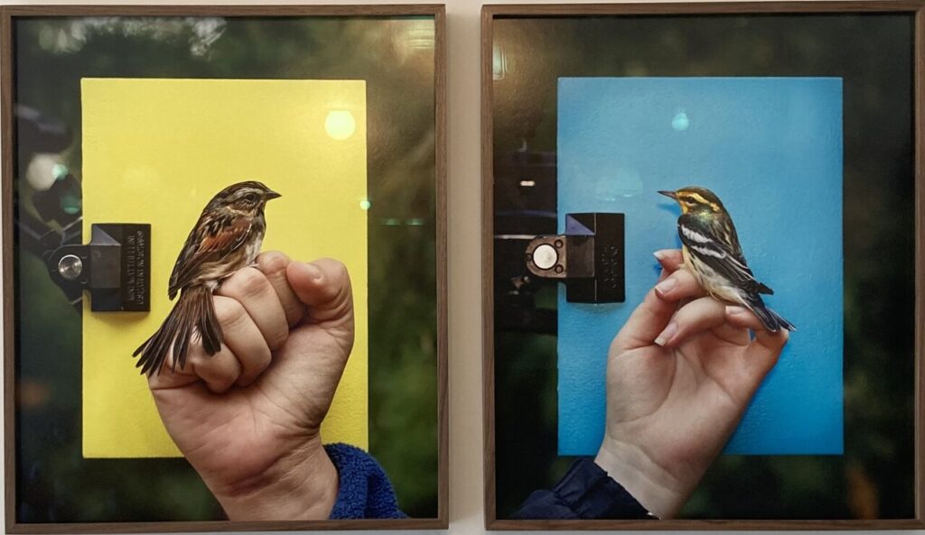 Presented with each portrait is a label noting the species of bird, such as CMWA + LULI (2023) with the title formed by Cape May Warbler and their human holder, Lucas Liu. O’Hara uses the first two letters of the species and the individual holding the bird in a combination for a title. The label also states the site, the Long Point Bird Conservatory, Old Cut Research Station in Port Rowan, Ontario. In this disclosure, viewers understand this site of learning is also one of performance. On that note, we understand birds as singers and in turn, as performers— something inherent to the species. The performance aspect can be perceived in their communication for food, travel, danger, mating, and in play. Witnessing the bird in this way prompts patrons to consider our perceptions of birds and how we project the performance aspect onto them, or whether we even consider them as being capable of composing their songs. Is it in their nature? Do we reduce their method of communication to a lesser version than those of humans? Or is it a case of different performers singing different songs?