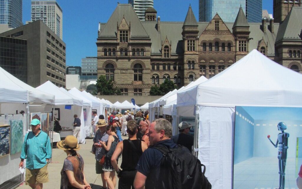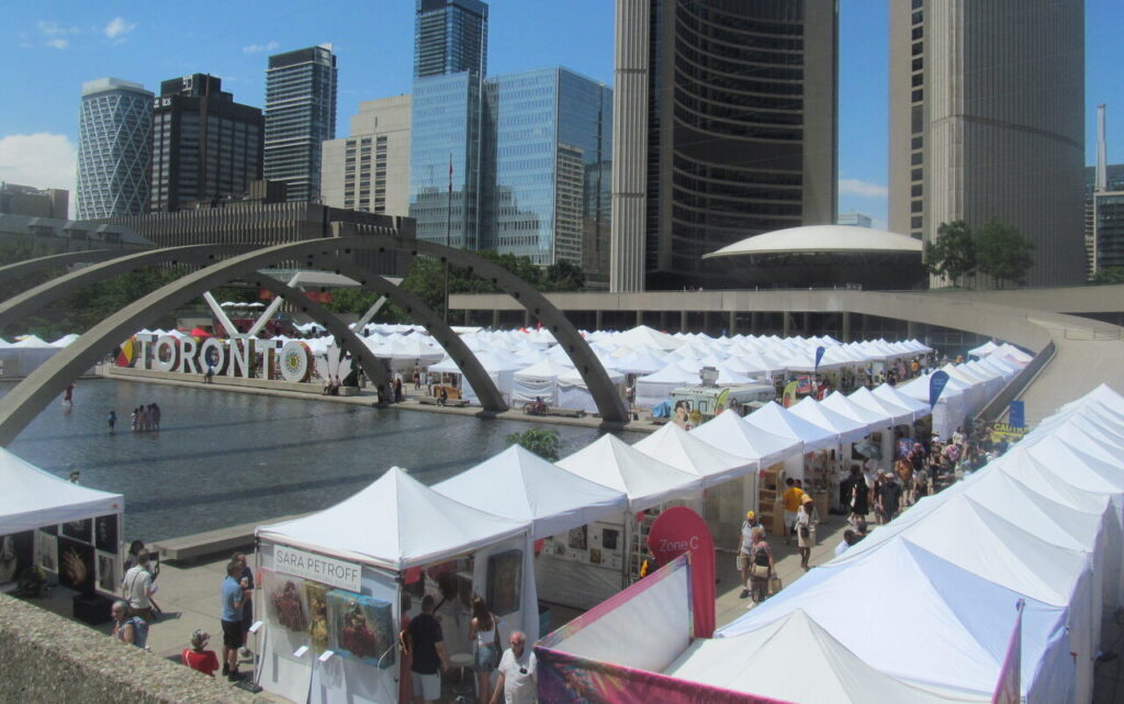 The weather was cooperating for this year’s TOAF with over 350 artists set up at Nathan Philips Square, though it did rain around 5 pm. An art supply company had given out some complimentary gift bags to artists in their booths and part of the loot included a hand fan. Artists were making use of the fans and trying to cool off. A couple of young people had taken to going into the water at the square.