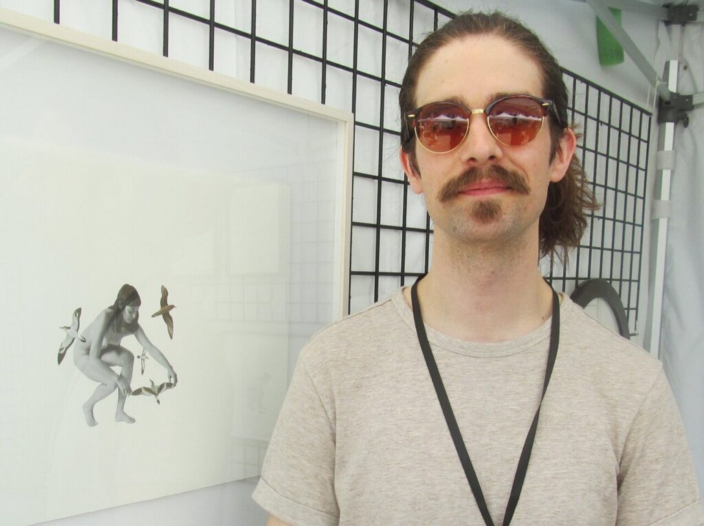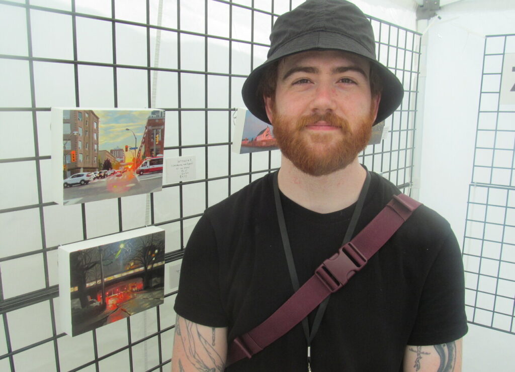 Artist Alex Millington thought TOAF was great this year, especially, experiencing it in person. He was accepted earlier, but then COVID came, so 2024 became his first year of participating in the fair. Kit Le draws her work by hand and then goes digital. I liked the work she did of the art building at Ossington and Dupont Streets. This was her first year at the fair. She described her work as “chaos within constraint”. Artist Colin Arthurs presented himself as a multidisciplinary artist whose subjects involve male behavior in various historical times.