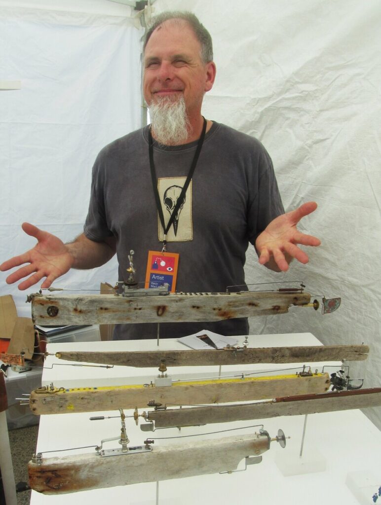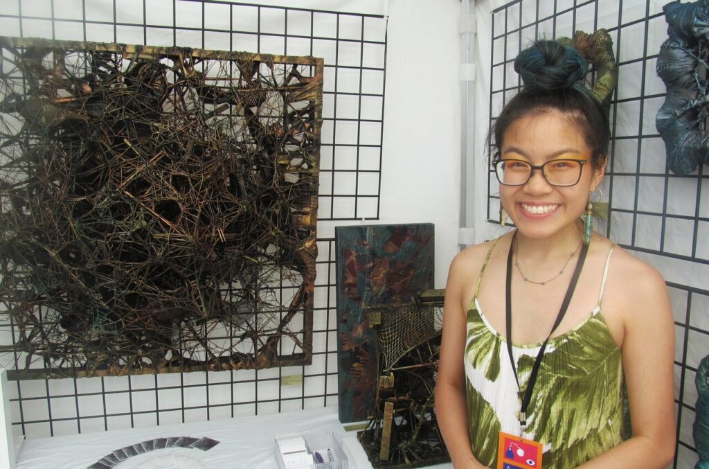 Self taught artist Sandamali Angunawela, besides her acrylic paintings, makes pencil portraits and started practicing this art form during COVID. This was her third year at the fair. Its a long way from Halifax but artist Kevin McLean has been participating at TOAF since 1992. He finds driftwood and creates model submarine vessels that are unique and fun. He has won in competitions for his sculptures at TOAF. Emily Zou uses recycling objects to create her environmentally friendly works. She enjoys bringing new life to those found materials. It is her second year and she said that she has learned a lot from her first year in 2023. She knows now that small works sell well.