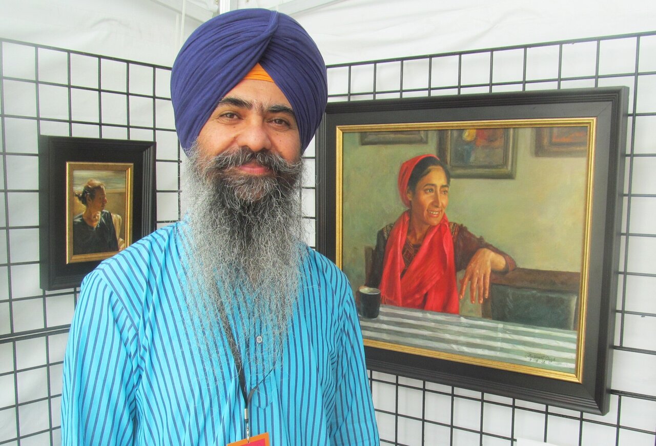 Kulwant Singh Bhullar, winner of the painting category, in front of his paintings
