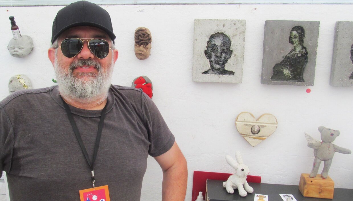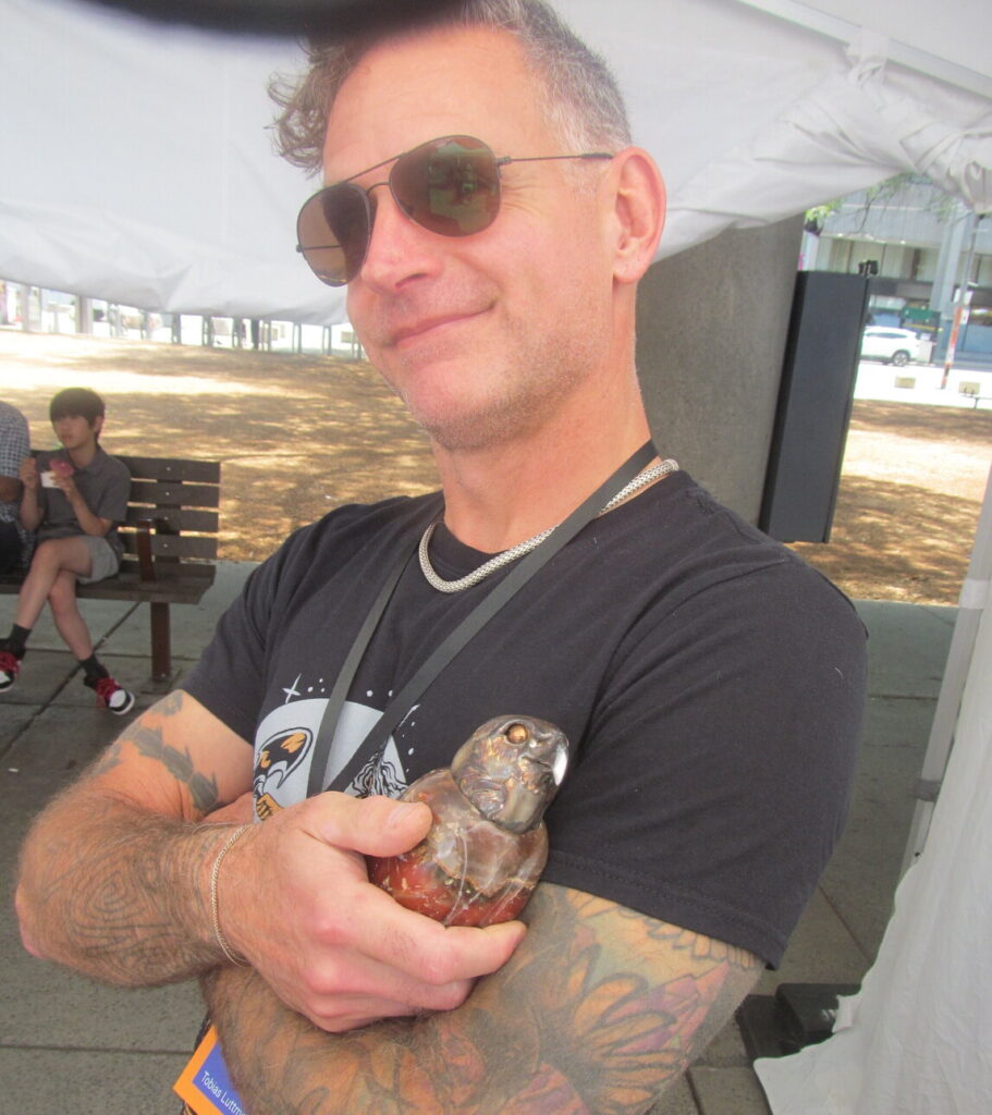 India born artist Kulwant Singh Bhullar studied drawing and painting and has an MFA. He has been participating at TOAF for over 30 years. Tobias Luttmer from Calgary attending the fair for the first year and was happy to get so much attention from the general public as well as from art buyers. He uses stone for the main body of his sculptures and then stainless steel to create the heads of the animal figures.