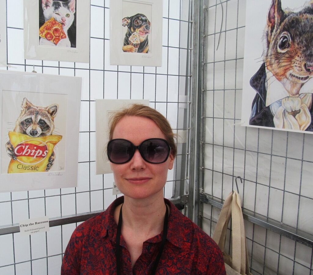 Deirdre Wicks draws animals doing human things, such as eating chips. She had studied Fashion at TMU but found out that creating art worked better for her. She believes humor is necessary in making her pieces. Painter Zack Atticus creates small realistic paintings that are very appealing oil paints on wood. I think these should sell themselves very well.