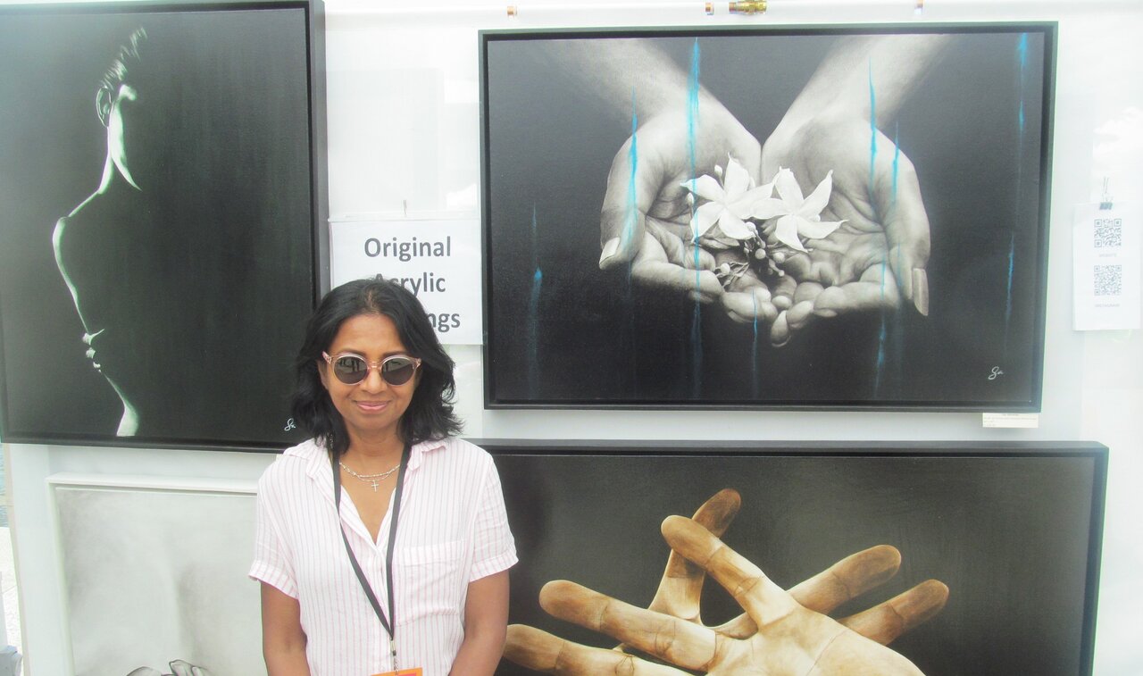 Artist Sandamali Angunawela in front of her paintings
