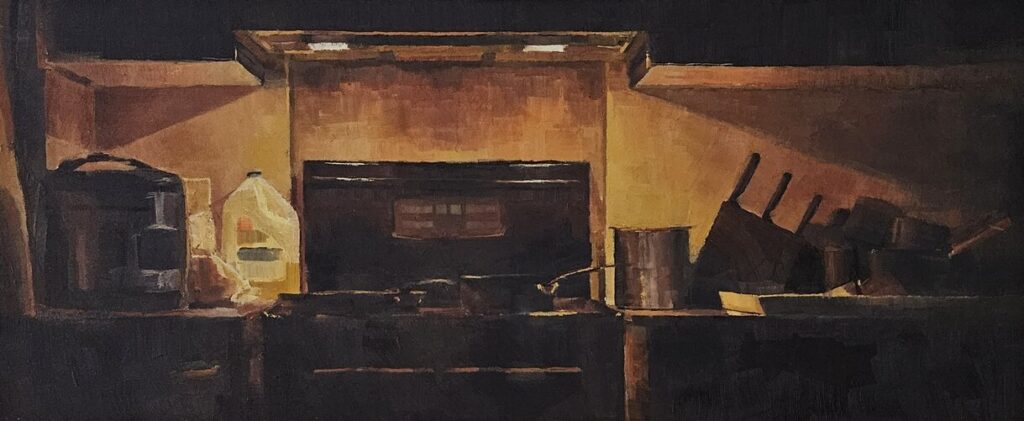 Whitby artist and OCAD U grad Edmund Prior’s large painting, “Daytripper,” portrays a group of tourists canoeing in Algonquin Park. Hamed Morovati, a Canadian Iranian, describes the immigrant experience in his two abstract paintings. Anshul Sharman, another OCAD U student, has created a beautiful painting of the interior of his apartment during the COVID isolation entitled “Quarantine Nights.” Its darkness expresses the loneliness of those times.