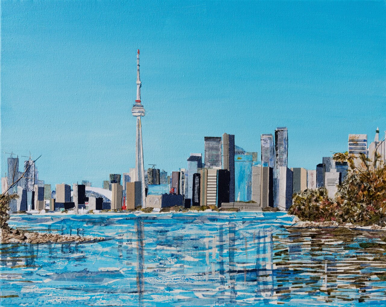 Environmental artist Kate Greenway participates with a landscape, “Toronto Waterfront” showing the Toronto skyline as seen from the Toronto Islands. It looks at first sight like a traditional painting but up close you notice that the skyline and the lake are made from recycled materials.