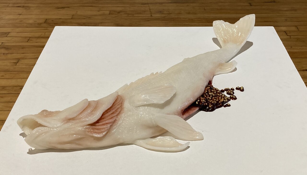 Working with highly realistic forms, “Bounty”is a gripping display of a walleye, lacerated at its stomach to reveal a sprawl of gold eggs in a pool of blood. Langer’s dedication is evident in the details, in the luster of the golden eggs and in showing the dramatic, cruel end of the fish in its arched pose.