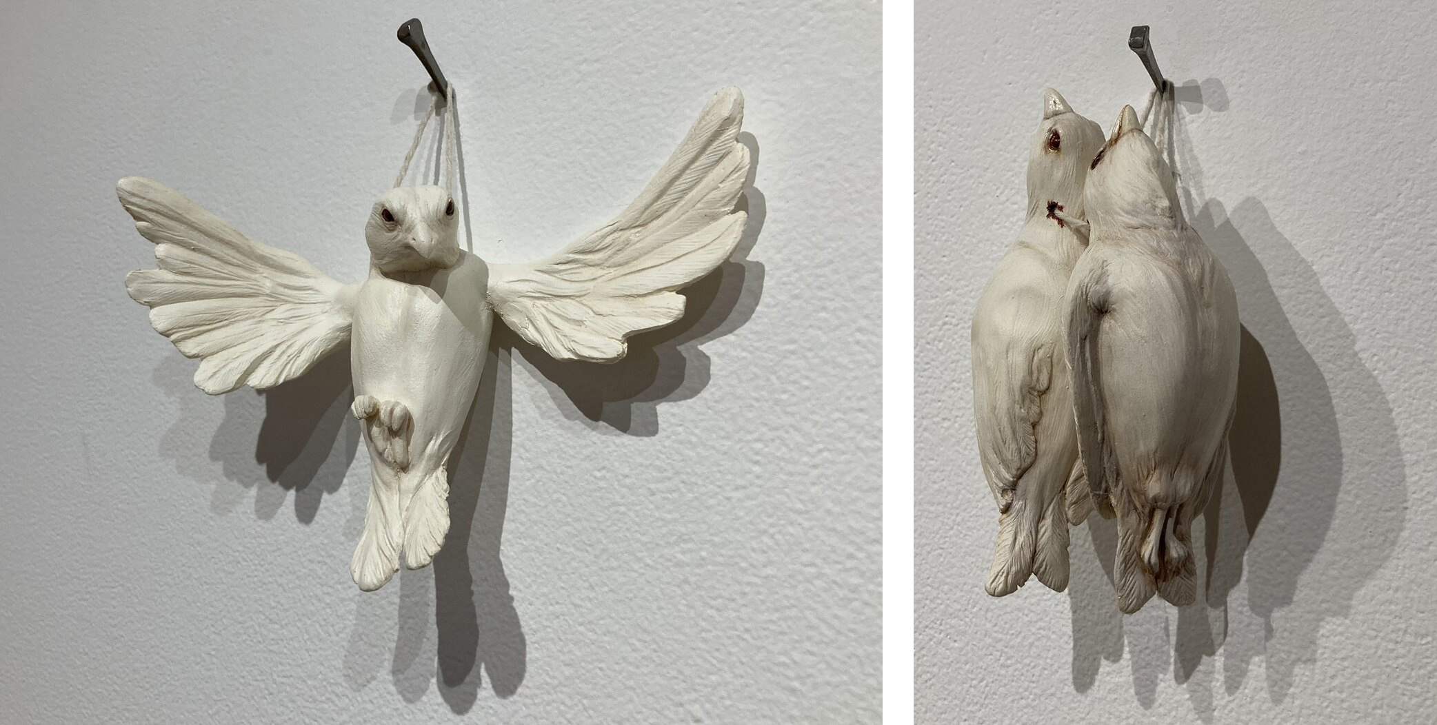 The motif of the small birds is also maintained in the highly realistic sculptures installed alongside the paintings, “Bundles” and “Bundles II.” They highlight the subjects, already easily identifiable in the paintings against the dark merlot—nearly black—background. The arrangement of the works suggests a cross, adding a hint of Christianity through the stigmata on the birds. The white bird symbolically suggests peace, though they are of a different species than the traditional dove. The works encapsulate the notion of pain on display, manifestations of violence, and looming loss— a fitting start to the exhibition.