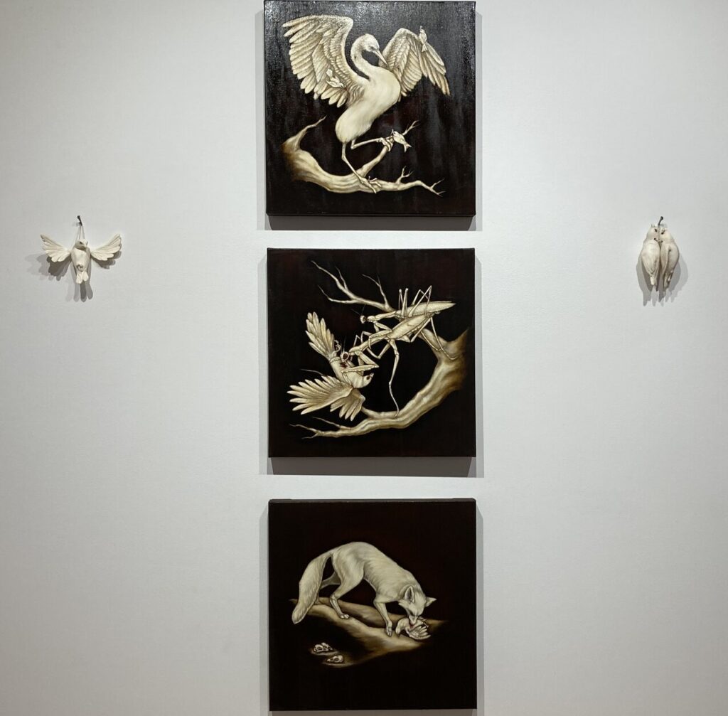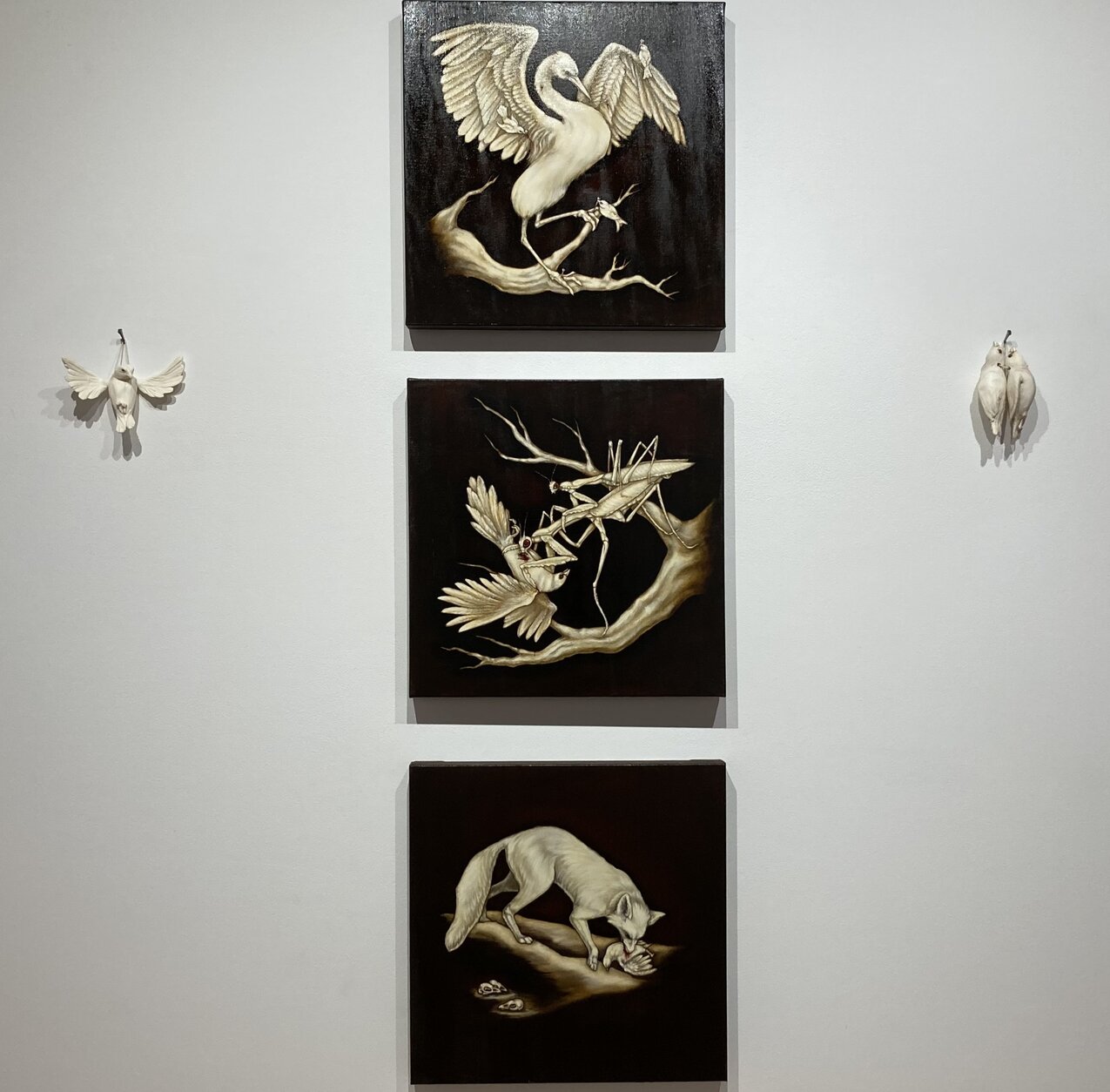 The installation created by Christy Langer consists of a series of paintings arranged in a vertical line, accompanied by a sculpture on each side. Each painting depicts cream-coloured birds. On the top is “Sebastian” with a waterfowl then it is being attacked by two praying mantes in “Martyr” (in the middle) and then in “The Merry” (on the bottom) the birds are consumed by a fox with remnants of other small birds as indicated by their skulls.