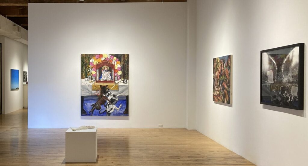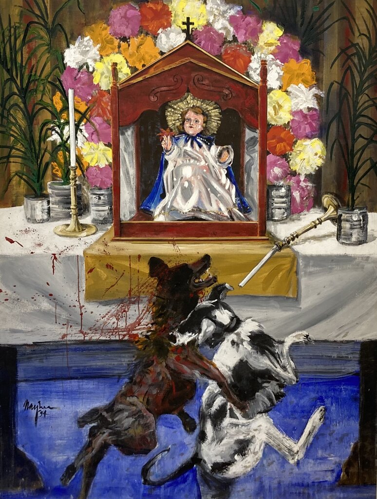 “The Empty Church” (1994) by Gordon Rayner features two dogs fighting in front of an altar. The altar is dedicated to the child Jesus, with divine rays radiating from his head. The Jesus figure is placed in a wooden shrine surrounded with a floral arch. The fight between the dogs adds an element of chaos to the devotional space by way of the splatters of blood and the fallen candles. Rayner’s depiction is of a violent sort of prayer, marking the transformation from supplication to desperation.