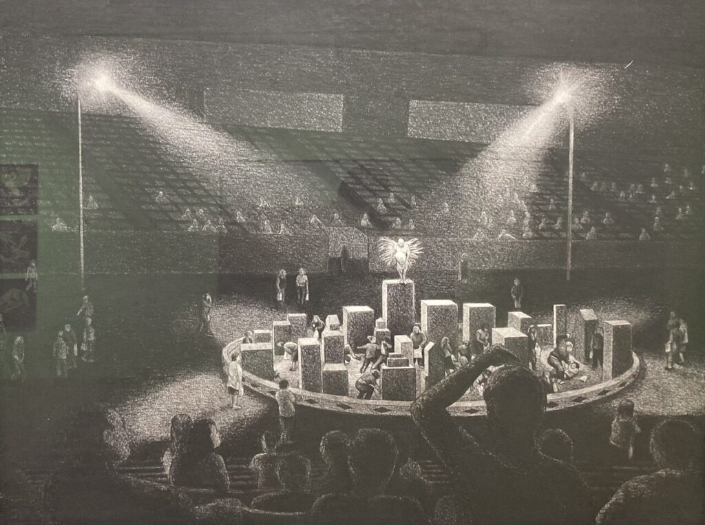 In Sherri Hay’s “Game Three” there are crowds of people: an audience watching men fighting in an enclosed, stone-labyrinth kind of area, on a spotlighted platform. The composition depicts voyeurism, people watching and even enjoying looking at people fighting and getting hurt, from a safe distance.