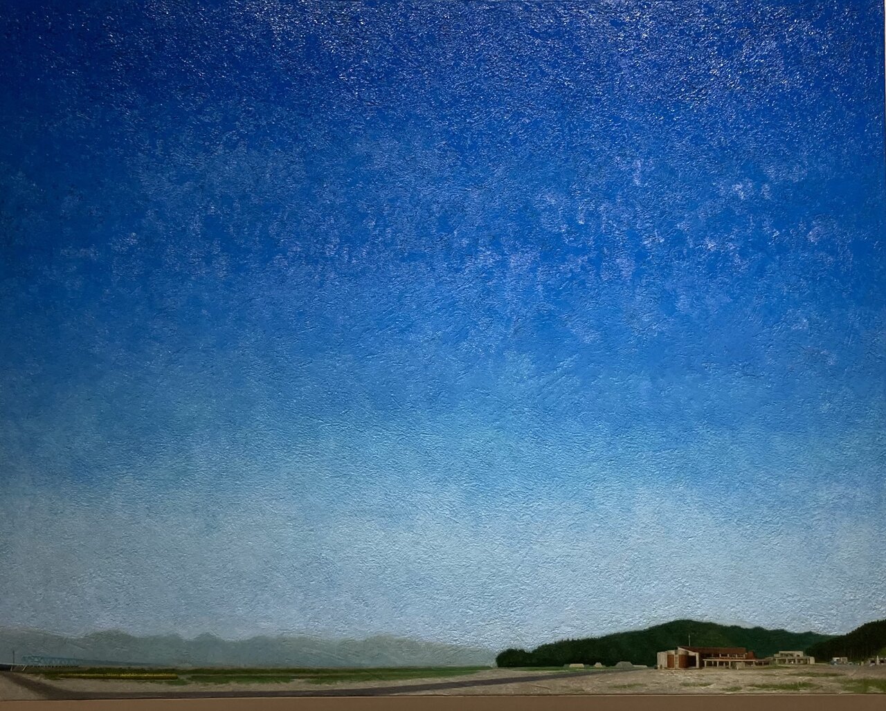 With loss comes loneliness and isolation as depicted in “Ishinomaki Okawa Elementary School” (2015) by Daisuke Takeya. The work depicts a bright sky moving from cobalt to powder blue. In the lower right corner of the painting are buildings situated in front of green hills. There is a highway establishing perspective in the lower left corner, with the road going past the buildings into the greenery. While it is beautiful, the isolation indicated by the lack of people is clear. Were those buildings left behind as a testament to the community? Will anyone return?