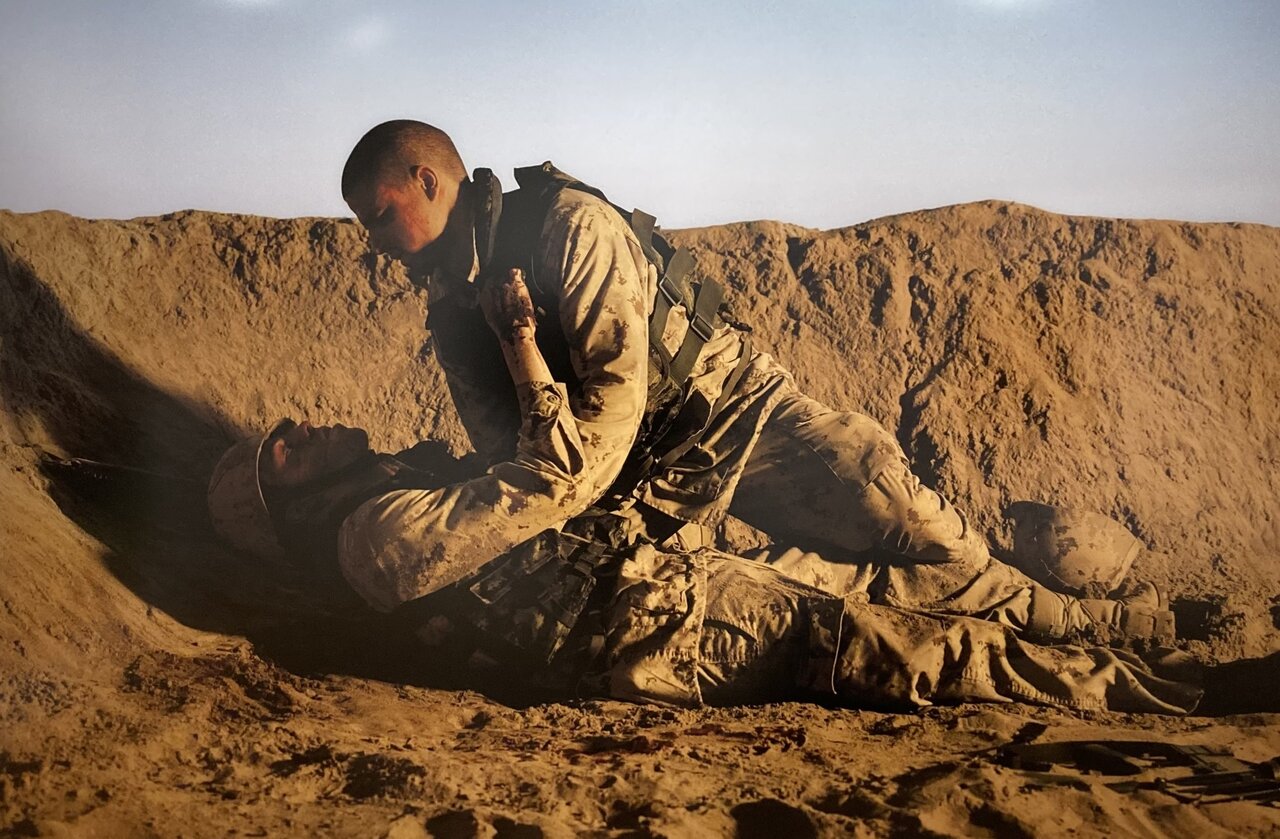 “Misuse of Youth” (2007) by Carlos & Jason Sanchez is also a dramatic piece. It depicts two uniformed soldiers somewhere in a desert in a shallow trench in the dirt. One of them is lying on his back, seemingly seriously hurt, unable to move, possibly dying. He desperately holds onto the vest of the other soldier, begging for help. Judging by the facial expression of this soldier, the chance of rescuing his comrade is very slight. “Misuse of Youth” reflects on war, violence, and whether or not photography can capture the magnitude of truth and hurt it aims to document. The scale of work captures the attention of the audience easily as the figures are nearly life-sized.