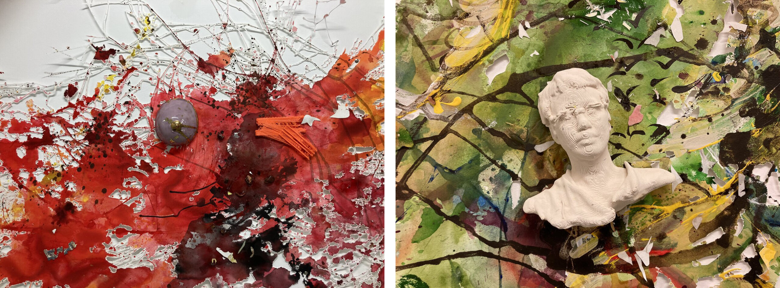 The crescendo of Sormin’s work is “Origin Myths”, spanning an entire wall and consisting of paper, ceramics, paint, and filament. In one section there is a shattered French bust, the fragments scattered within the lower right portion of the expansive work. Hidden among the shards is a tiger, a formidable foe though not exempt from extinction. Can culture recover from being endangered? Among the splatters of colour are more sculptural details such as a mauve breast with a gold nipple, orange tracks of filament prints, and a 3-D printed bust of the artist. The careful insertions of these objects prompts one to reflect on their inclusion: to be nurtured and grow in another land, accessing privilege others are deprived of; the artifice one feels in engaging with their ‘motherland’ though living elsewhere; inserting oneself into the cultural fabric to better understand who they are. Both Nishimura and Sormin recognize the difficulty in knowing two worlds, recognizing the gaps in understanding due to the inability to exist in both simultaneously. This does not necessarily reflect a shallow understanding, solely that there will be tethers and connections, but not a solid whole.
