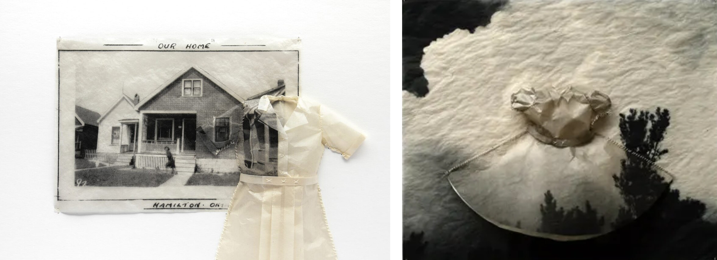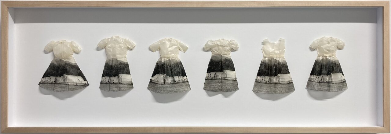 Nishimura’s Grandmother’s Dresses (above) and Emma Nishimura, Shikata ga nai: It cannot be helped, 2024, photo etching with gampi with thread, framed, 19 x 33.75 inches (below). Photo: Rashana Youtzy