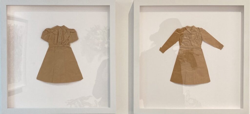 I was captivated by the miniature dresses in frames along the wall. Each of the dresses has a unique design, carefully stitched together out of paper. The paper contains black and white archival images or text. The sewn paper works are Nishimura’s effort to understand the effect of internment camps on the Japanese community. The dresses are a return to the motif that inspired Nishimura in graduate school, borne from the patterns created by her grandmother. Works such as those in “Shikata ga nai: It cannot be helped” (2024) are delicate and can fit in one’s palm. The surface of each varies: trees, a home, a crowd of faces.