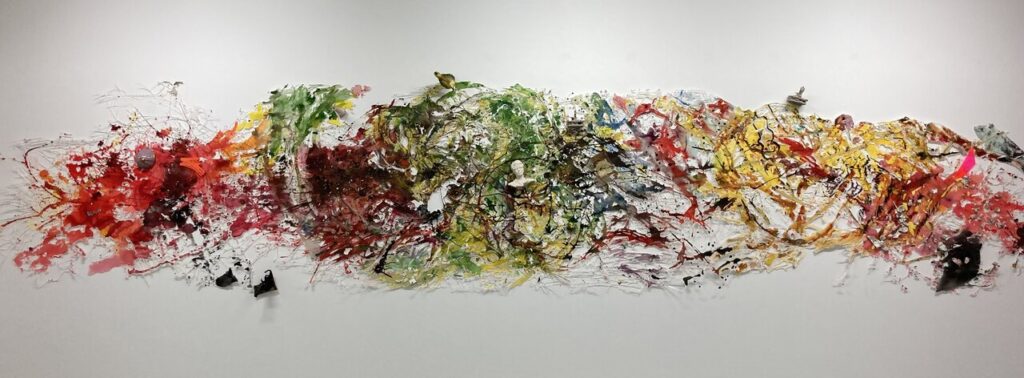 Linda Sormin, Origin Myths, 2024, hand-cut watercolour and graphite, resin, ceramic and acrylic shards. 56 x 265 inches (above) and details (below). Photo: Rashana Youtzy