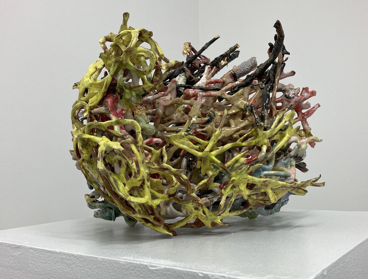 The interconnection between generations in a culture takes on a more literal representation in Sormin’s works. Throughout the gallery are various sculptures in the form of webs, scrolls, and multimedia works. The web sculptures are polychrome with layers upon layers of glaze.