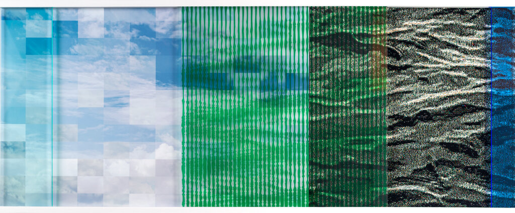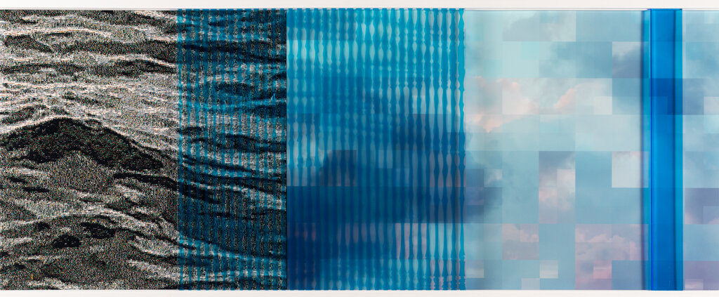 Horizon, 2022, Jacquard Tapestry, UV printed aluminum and Plexiglas construction.