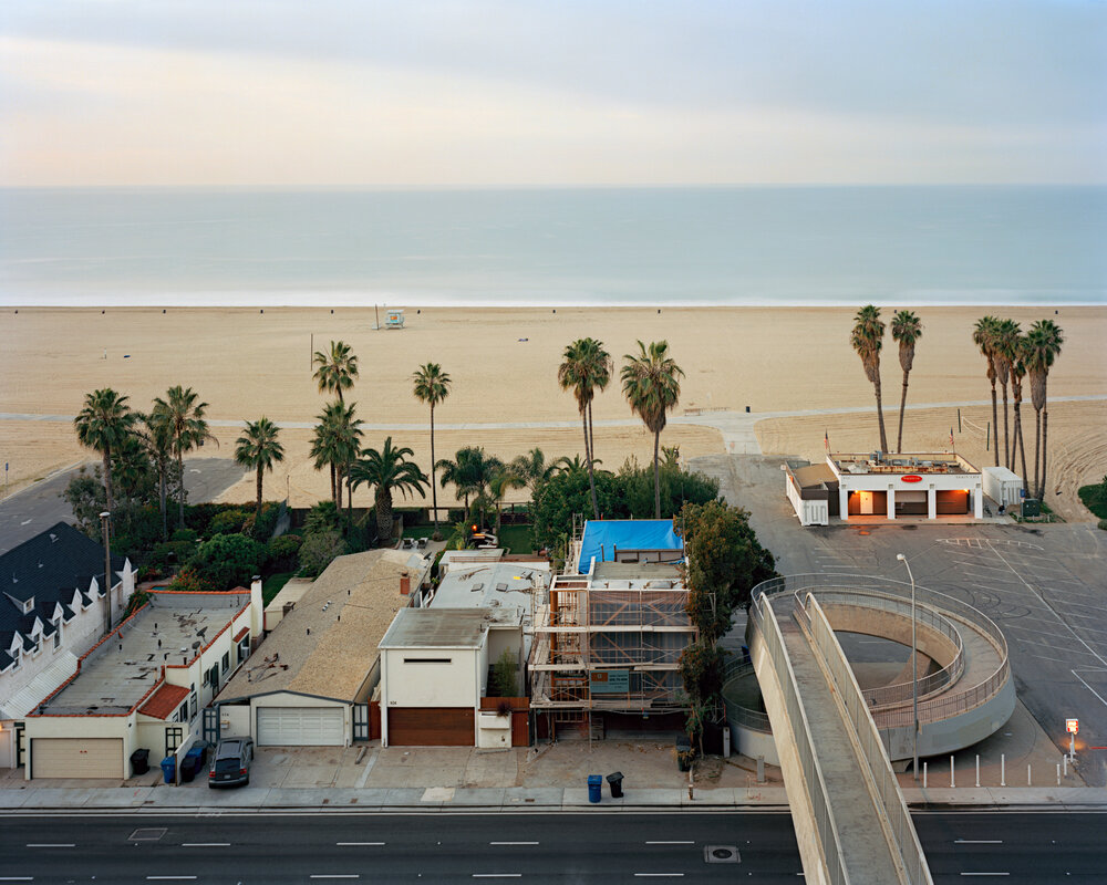 As well, the viewer quickly notices that the most of the pictures are taken from an elevated point of view, i.e., from up high. Again, Conarroe is careful to search out a highpoint in the landscape – a cliff or building, say, – from which to take his shots. Only after he has done so does he choose and compose his picture. This strategy is perhaps most obvious in his “Pedestrian Walkway, Santa Monica, CA”. Here we see a sandy beach foregrounded by a complex of buildings decorated with palm trees behind it. The viewer would be forgiven for assuming this picture was taken by a drone because of the flatness of the landscape it depicts. In fact the shot is taken from a cliff top, obviously out of sight.