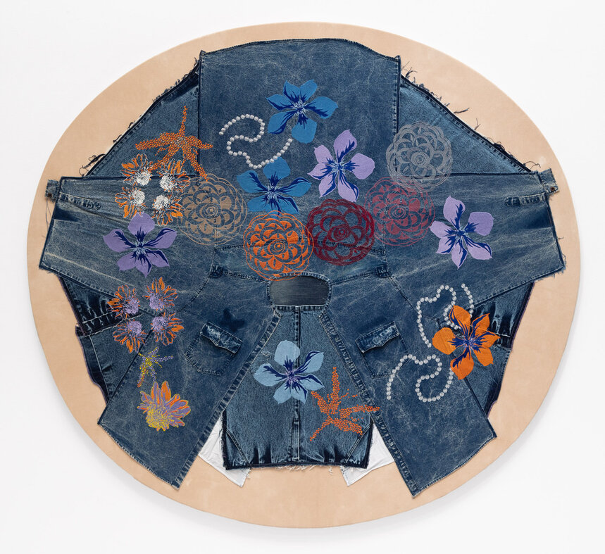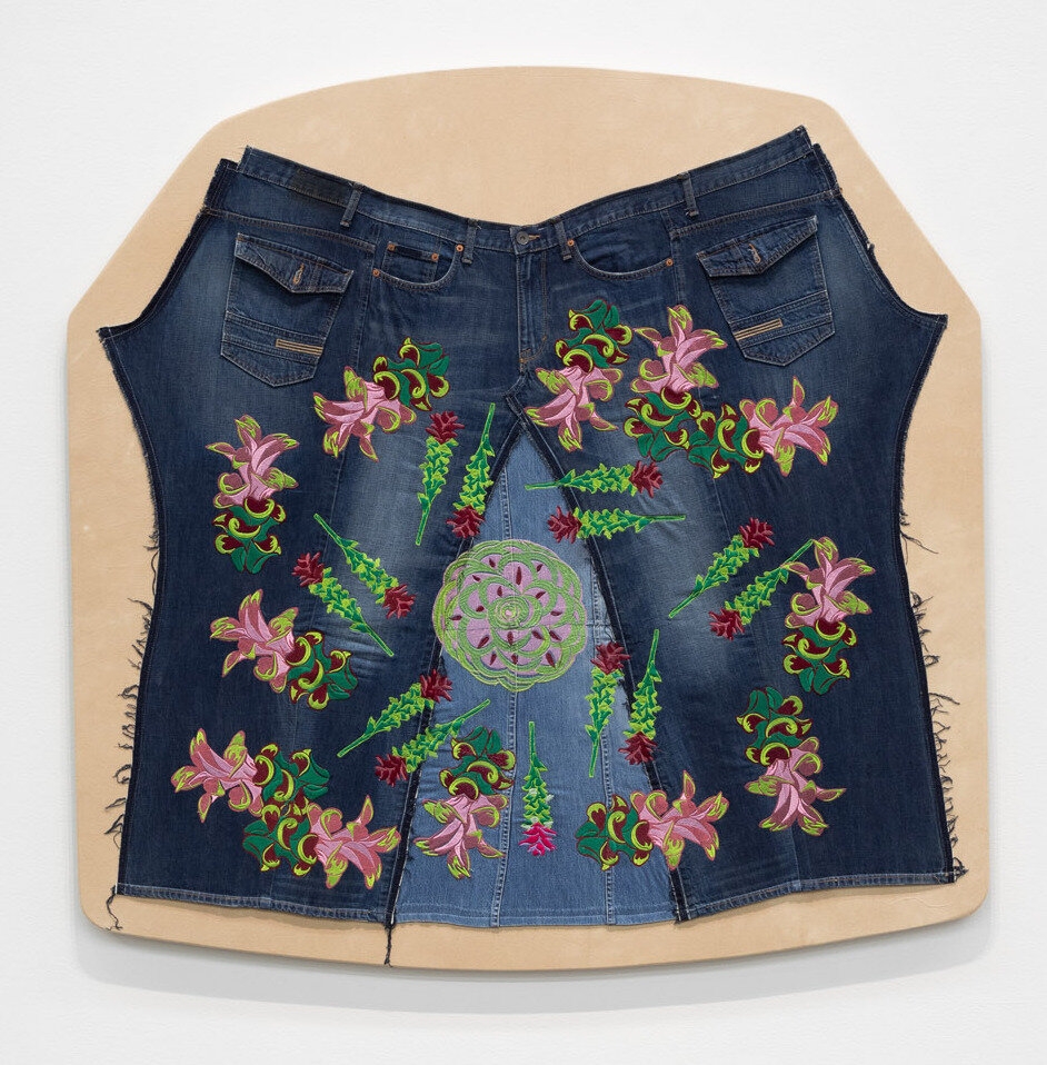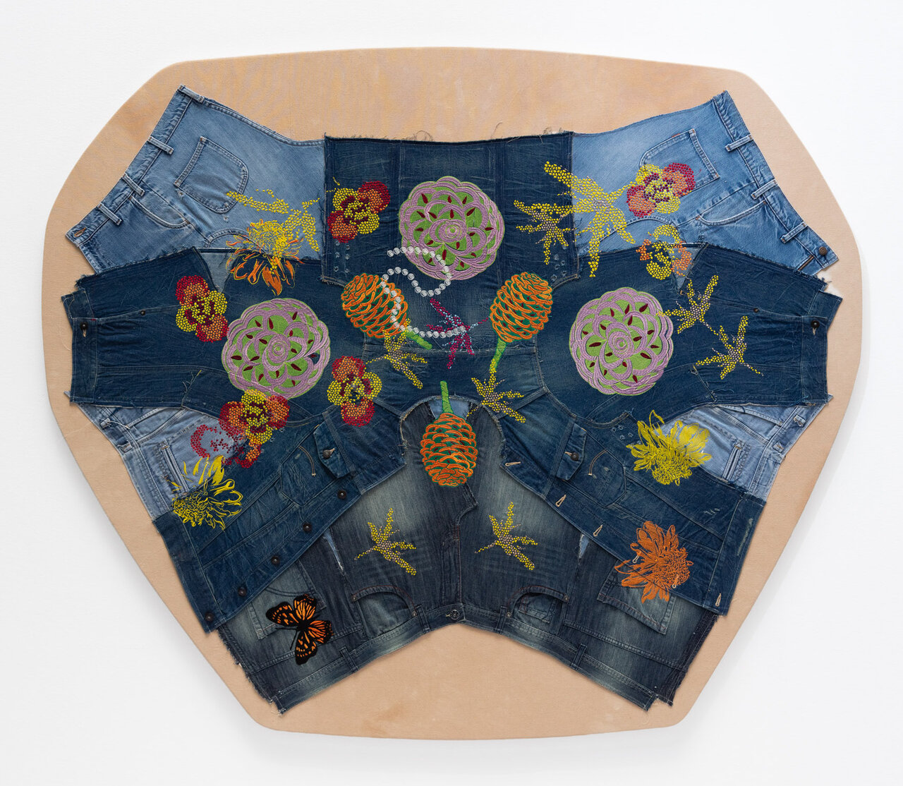Stephanie Comilang, Cocoon Curcuma, 2024, embroidered denim on tea-stained canvas over board, 52½ x 53 in.
