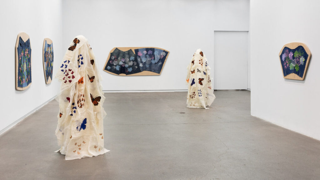 In her 2024 film, “Search for Life”, which is paired with this exhibition, the monarch butterfly serves as both a narrator and as a symbol of hope for two former seamen. In it, they share their stories and reflect on the abuse faced by the people of the Philippines under Spanish colonization. Having retired by the time of filming, one of the seafarers had turned to art and painted the figure which Comilang carefully adopts as the “Manton de Manila.”The fisherman’s vision is executed with the use of piña fabric, known for its delicate texture and breathability. Tens of pieces of fabric come together to veil a female mannequin, much like the traditional Filipino shawl with which the piña fabric is associated. The effects of colonization such as globalization and technological innovation are present in the butterfly’s pixilated design and use of machine embroidery, as well as the Chinese origin of the shawls which the Spanish appropriated and manufactured in Manila. Amid the layered history held by each of the piña fabric’s threads, the delicate and vibrant monarch butterfly emerges as a powerful symbol of resilience for the Filipino people. In rising out of its piña fabric-crafted background, the butterfly relates to the narrative of how the Philippines has held onto its complex history and cultural heritage through its perseverance and strength.
