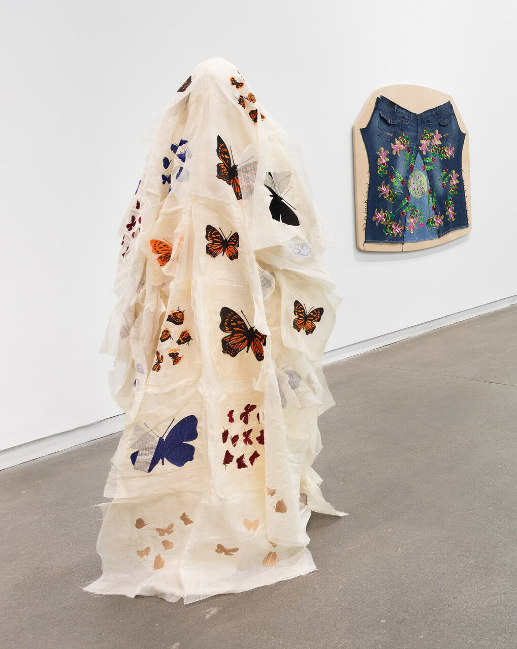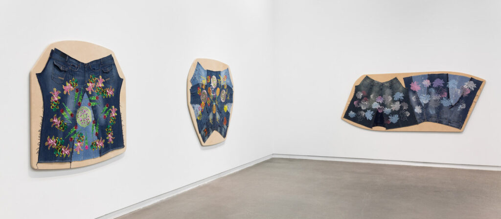 Stephanie Comilang, Fragilis, 2024, embroidered denim on tea-stained canvas over board, 65 x 71 in.