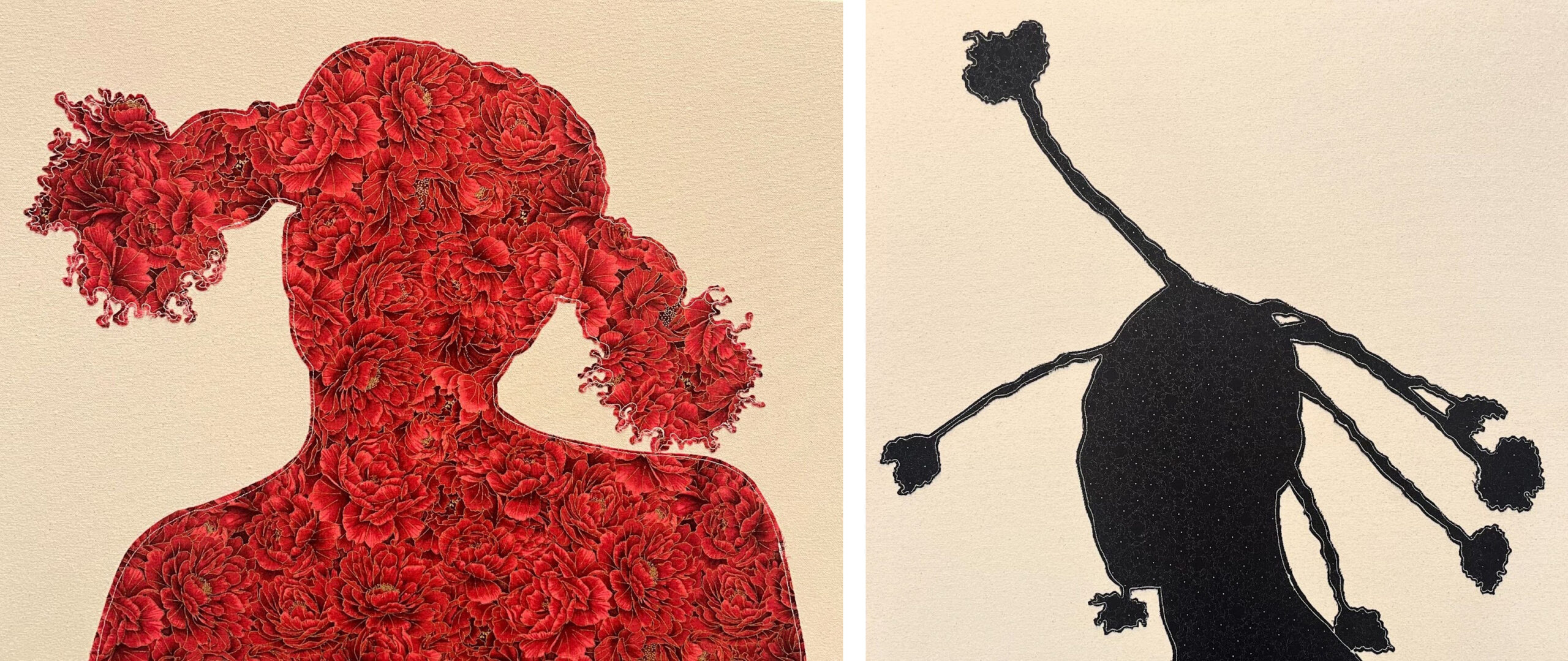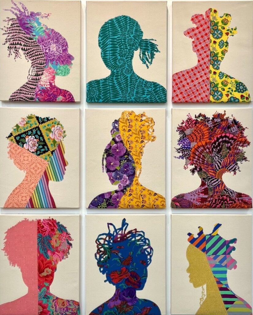The silhouettes, titled “New Growth 2nd Chapter #12” and “New Growth 2nd Chapter #13”, convey warmth, love, and appreciation. Her work can be seen as ‘incomplete portraits’ because there are no facial features, inviting viewers to appreciate the beauty and allure of Black women. This approach celebrates the creativity of Black hair and captures self-expression and transformation. The colour and floral pattern of the textile is another thing that adds personality to the silhouette.
