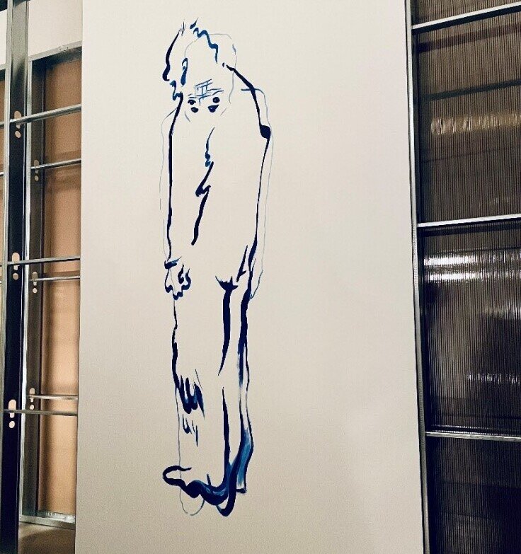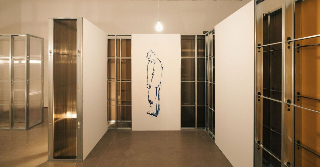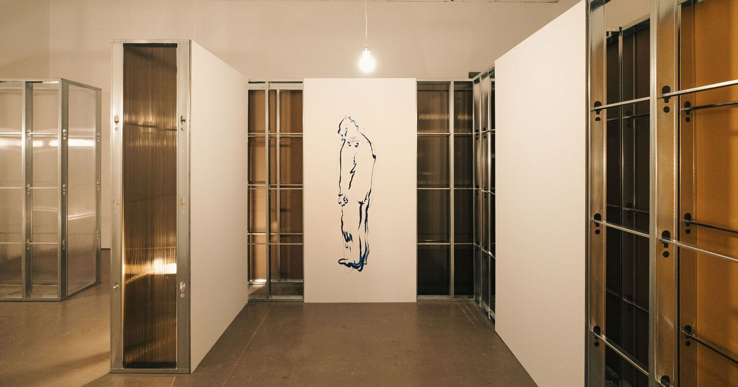 As the narration continues, sounds like whispers and footsteps can be heard from the other room, almost reminiscent of the feeling of being home alone. The theme of loneliness becomes evident as the narration itself mentions: “What to do with the feeling of being left alone?”. The idea of vulnerability has also taken form by the artist having handed over his personal diary entries from lockdown to a friend, Ndobo-emma, who has essentially appropriated his stories by using them for the sound work of the installation. Vulnerability is hence seen through the sharing of such fragile material with the public, but also by exploring the degree of resilience and the vulnerable state relationships themselves create. The artwork presents itself as being very real and existing within our world, or, being made of it. Although its inviting quality may form impressions of domesticity, ideas of violence presented through sound counter its tenderness and contribute to an eerie atmosphere”. A similar contradiction can be noticed in the architectural forms of the installation, where structures seem to be in the process of being built, but also of being deconstructed. Blue painted figures and faces on walls are also half-existent with their translucent quality of contour and hatched drawing techniques.