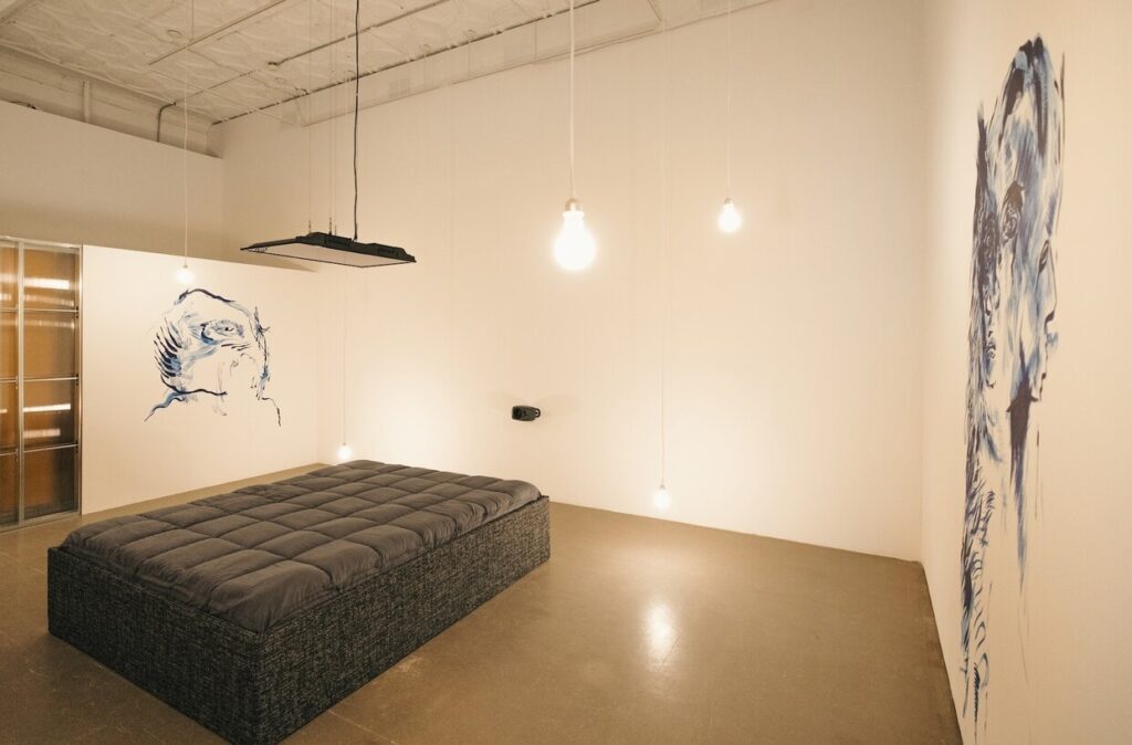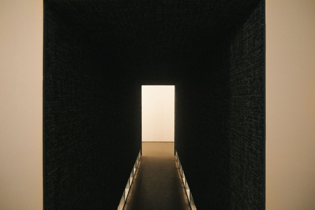 The experience of the space provides a feeling of safety, but also simultaneously makes one feel unsafe. Instrumental sounds gradually introduce verbal elements as male and female voices begin to narrate. Sometimes the narration is done in French, further fueling the visitor’s curiosity and desire to know the full story. The narration later dissolves into a gentle song sung by the female voice, where lyrics about the pain experienced from a relationship are accompanied by intensifying sounds. A tunnel separates the gallery space into two rooms.